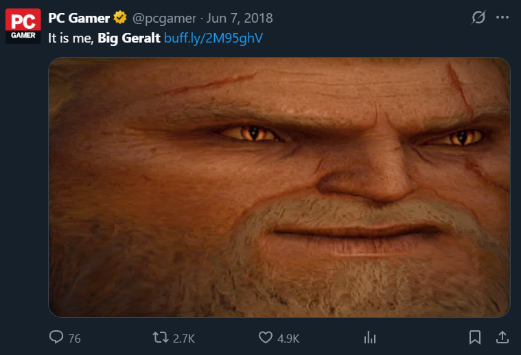 A lesser-known running Geralt joke came about after modder Votislav posted a stretched-out Geralt face from The Witcher 3’s files. We dubbed it “Big Geralt.”