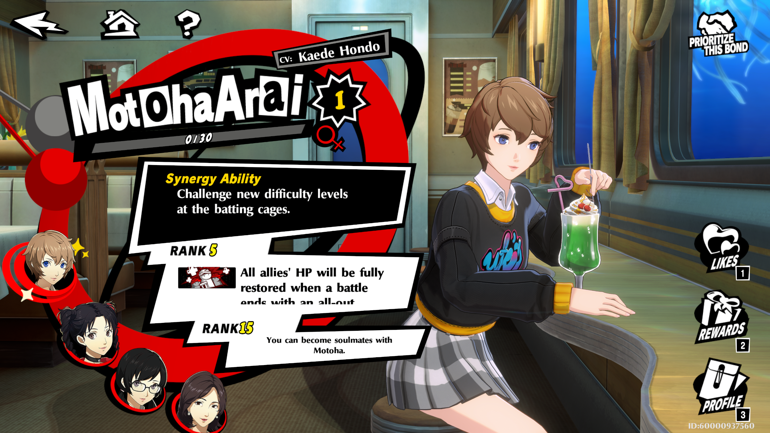 You can unlock her Synergy Bond by completing the “The Day the Pearl Flies” side mission. Improving your relationship with Motoha will unlock higher difficulty levels in Batting Practice and provide you with bonus effects in Palace and Mementos.