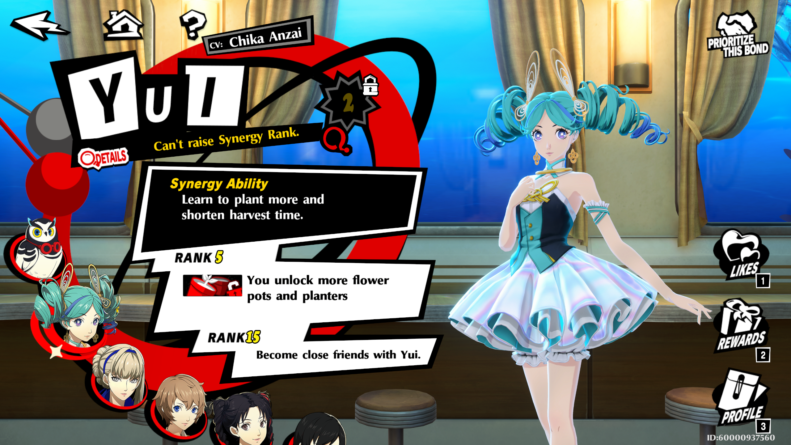 Yui’s most prominent personality trait is her affection for farming. Her passion is rooted in the late stages of her Synergy bond ranks, but she’s friendly and another one of Phantom X’s uniquely designed characters. Since her Synergy Bond takes place primarily in the in-game MMO Harvest World Online, her Phantom Thief appearance is based on her virtual avatar instead of her authentic self.