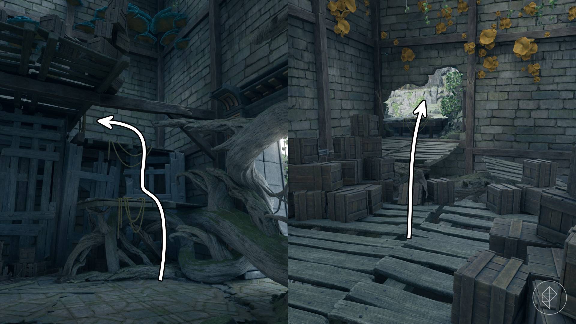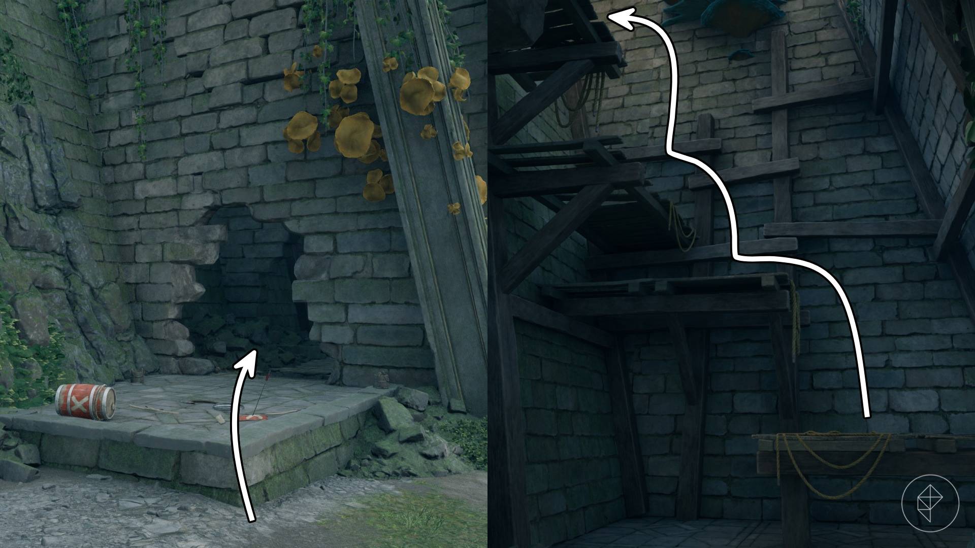 9. Follow the pathway into the building and climb the wooden platforms in the corner of the room.