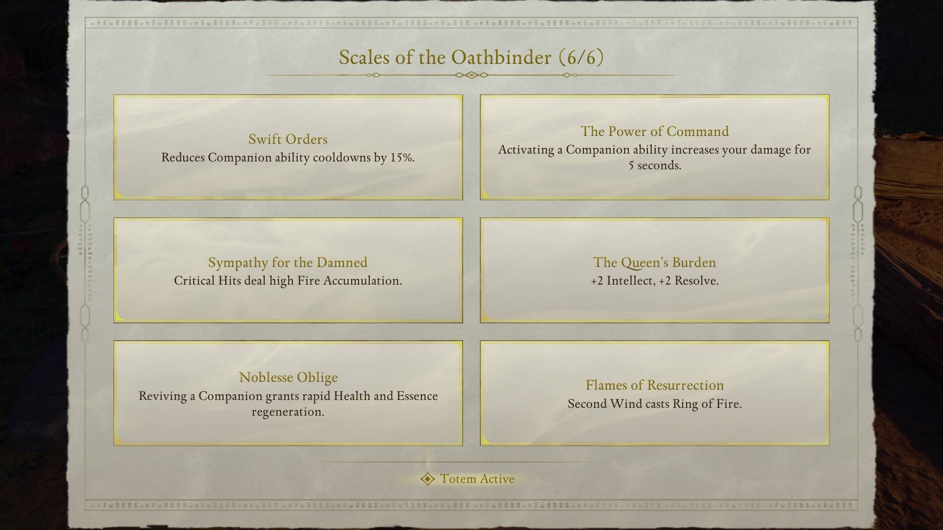 Once you have all of the Totem of Rightful Rulership pieces, head to the Totem Shrine at your party camp and reassemble the Scales of the Oathbinder. Activate the totem to receive the following buffs: