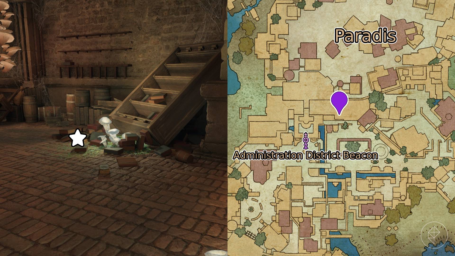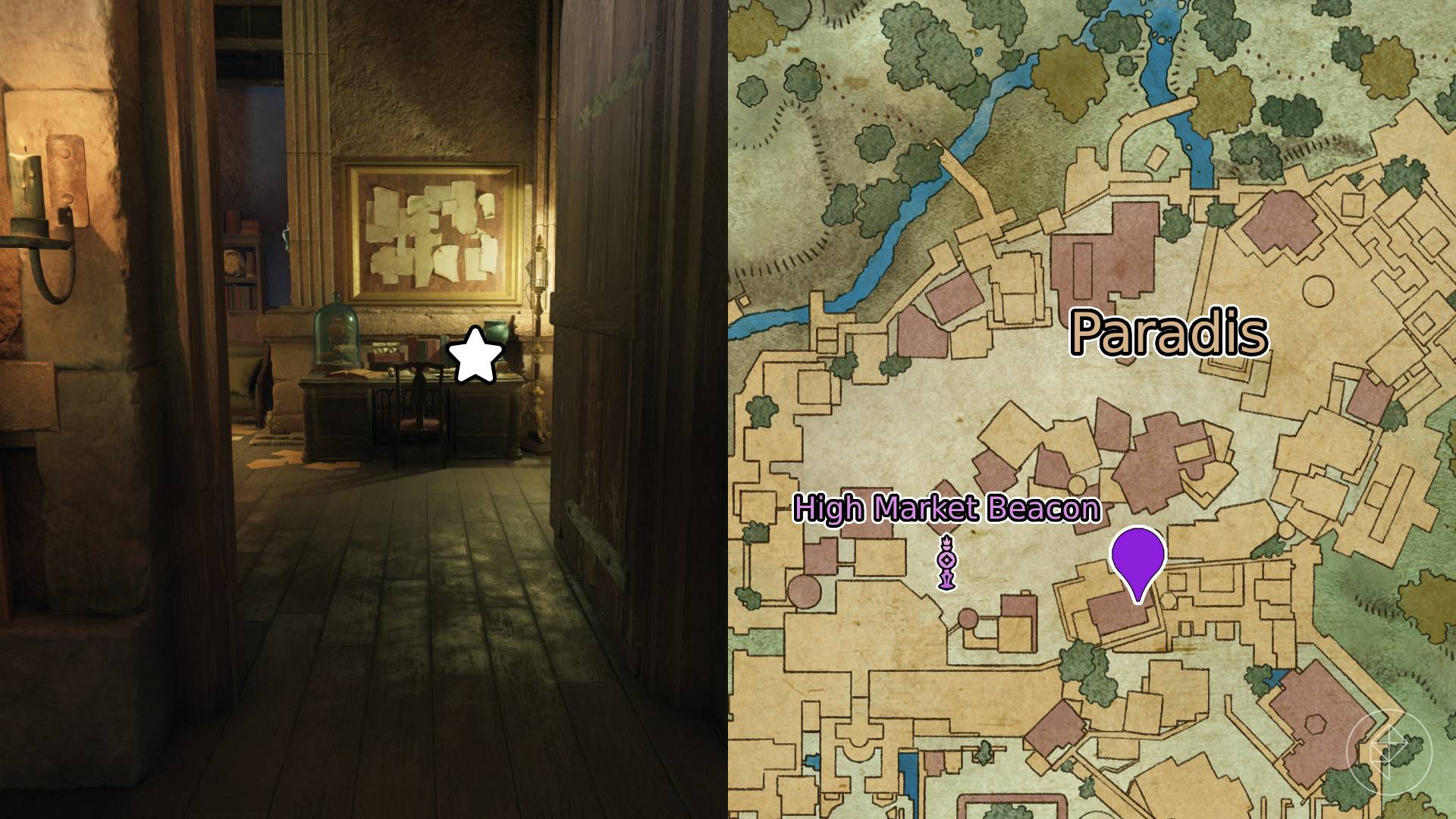 The Golden Scale of Justice can be found inside a building north of the Market District in Paradis. The main entrance to the building is locked, so you’ll need to go through its balcony.