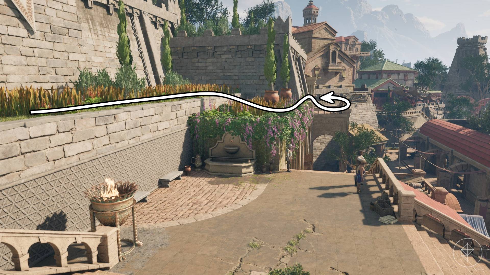 4. Drop down onto the other grass patch and walk along the stone wall towards the balcony.