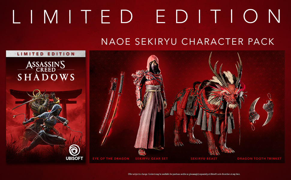 Pre-ordering the standard version of Assassin’s Creed Shadows from any retailer, whether physical or digital, grants you access to the “Thrown to the Dogs” bonus quest at launch and the “Claws of the Awaji” expansion, which will become available later in 2025. However, there are some slight differences depending on which retailer you purchase from. Reserving a copy at Target will gets you access to an exclusive Steelbook case, while reserving the Limited Edition from Amazon gets you the Naoe Sekiryu Character pack which includes a modest collection of in-game cosmetics in addition to the pre-order quest content.