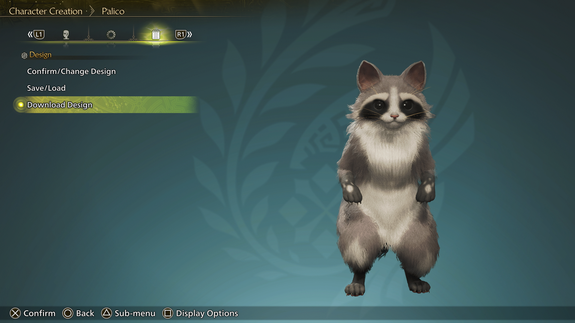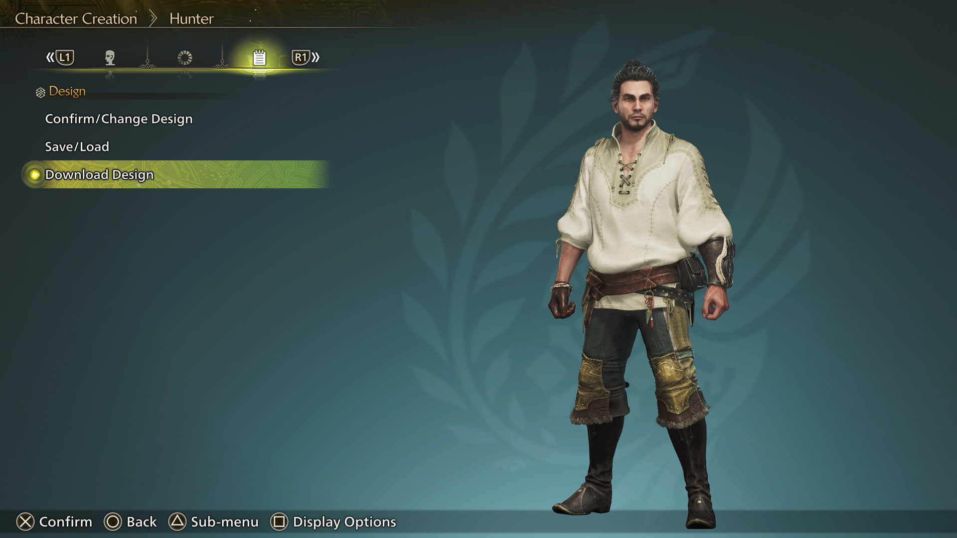 Start a new game or use a character edit voucher to enter the full character editor in Monster Hunter Wilds. Once you are in the character creator, tab to the icon in the menu that looks like a little notepad labeled “Design” and select the option “Download Design.”