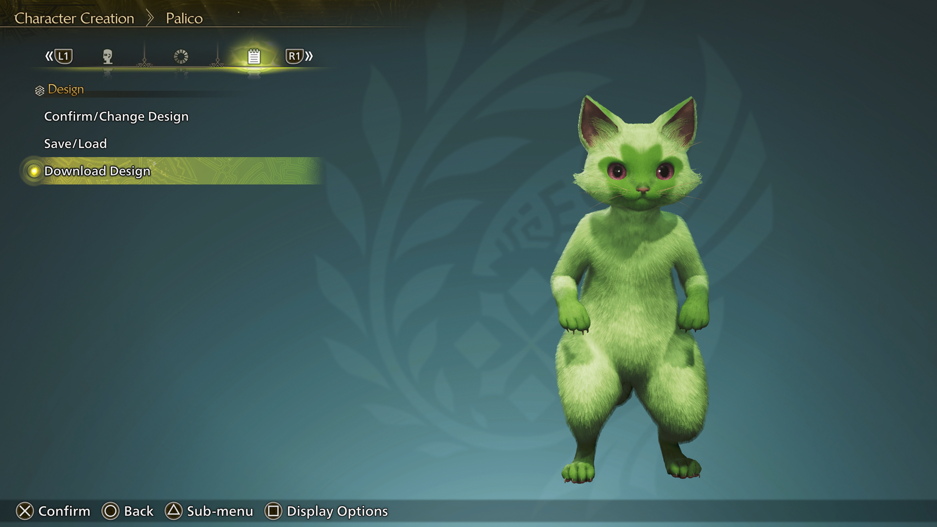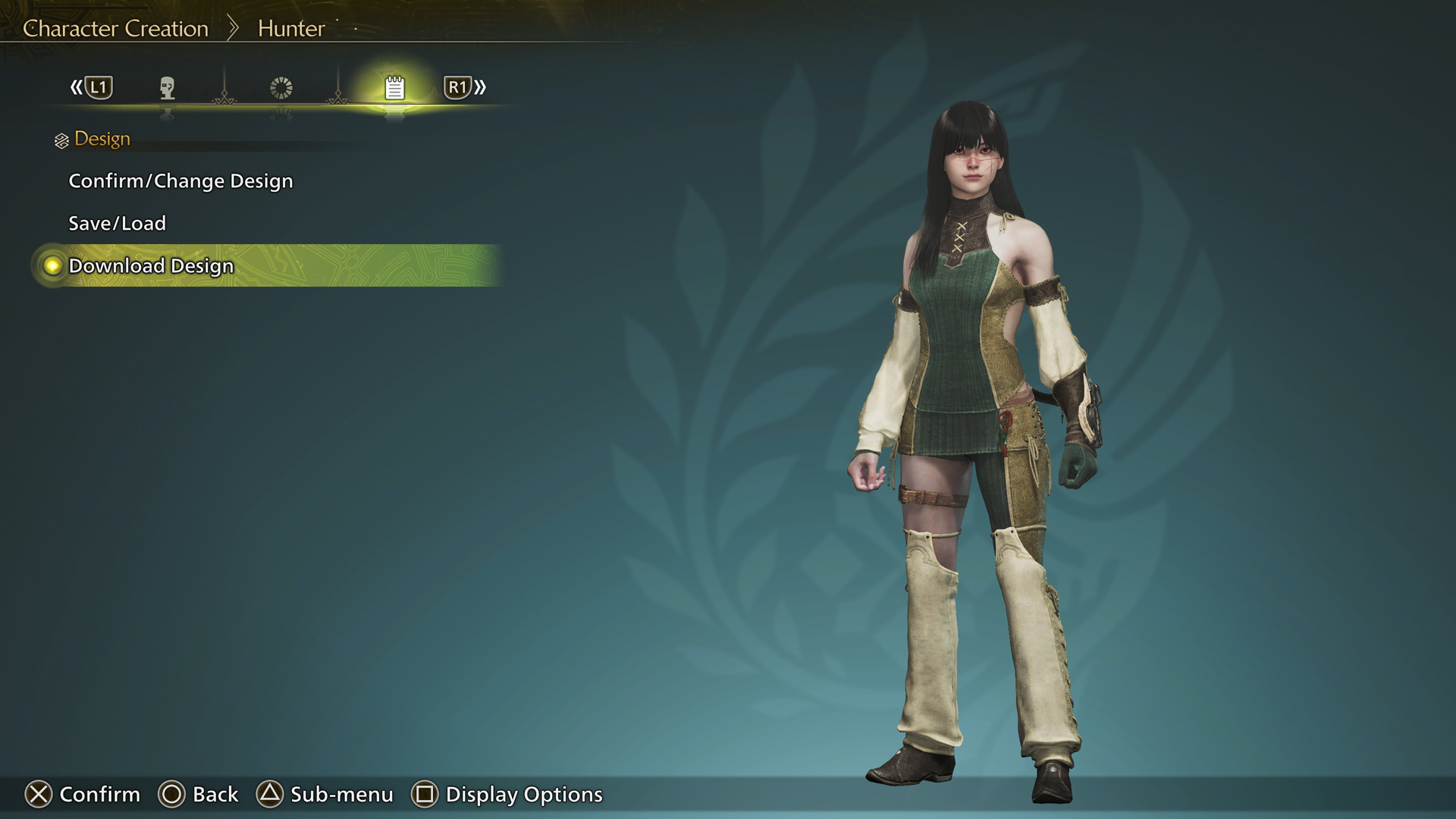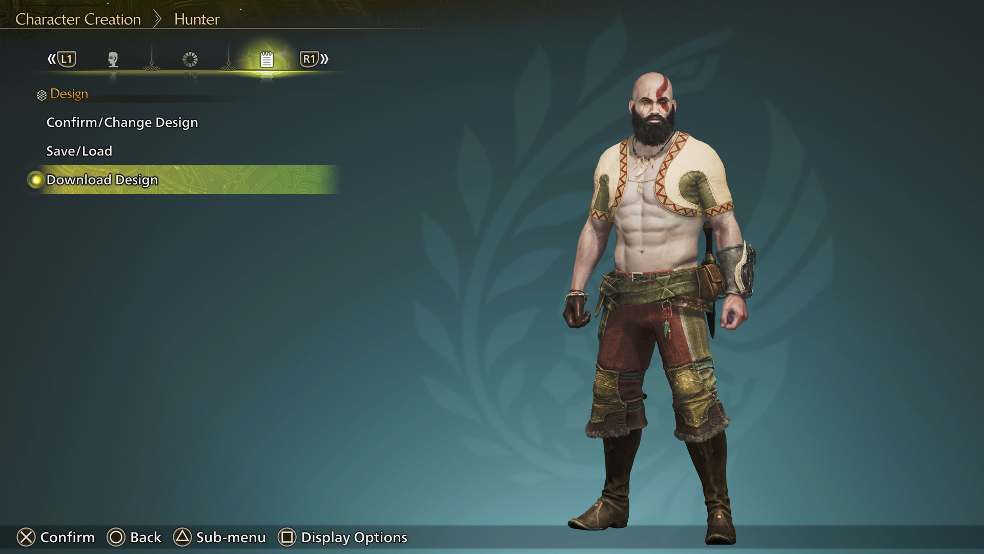 Start a new game or use a character edit voucher to enter the full character editor in Monster Hunter Wilds. Once you are in the character creator, tab to the icon in the menu that looks like a little notepad labeled “Design” and select the option “Download Design.”