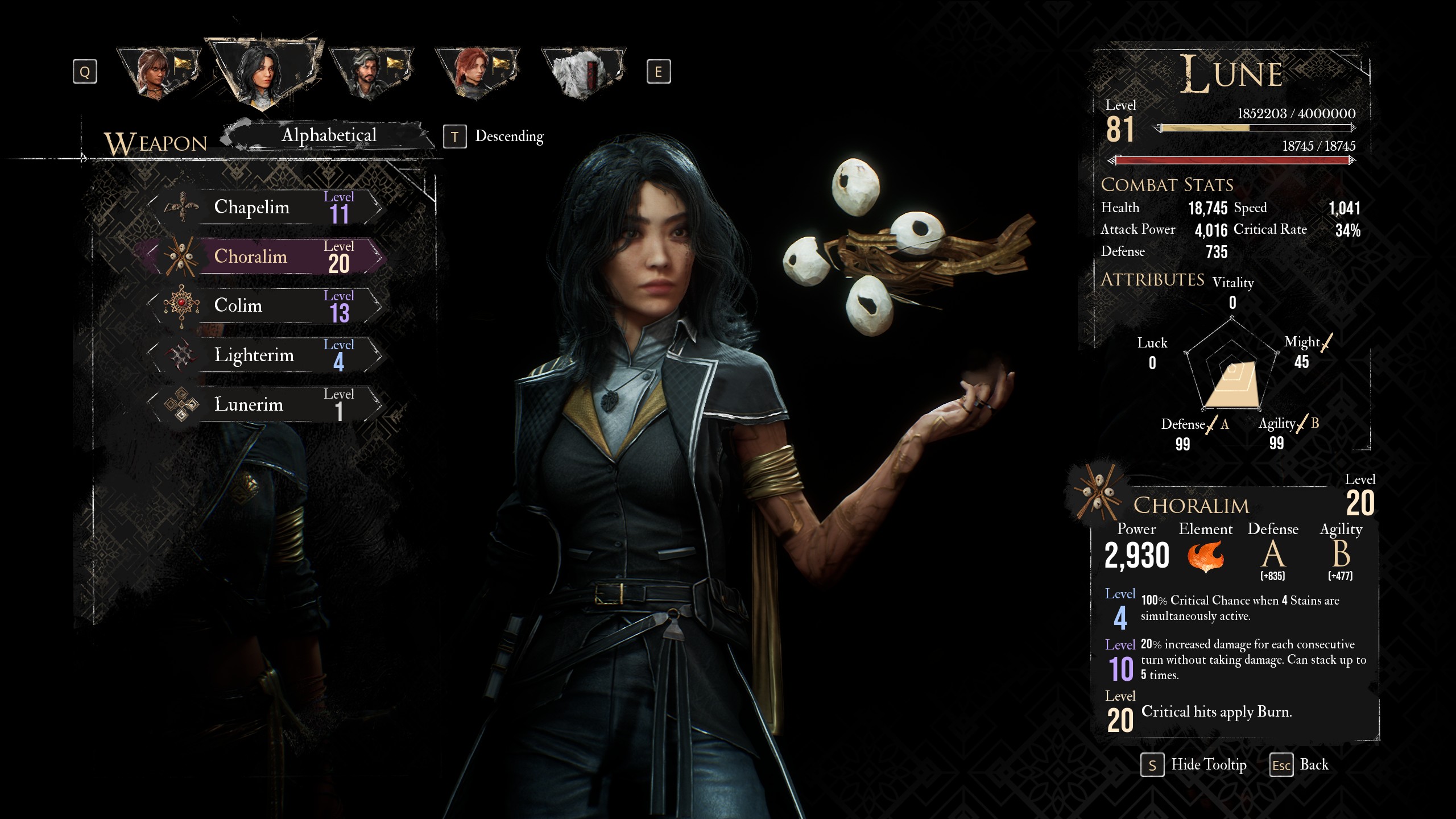 The Act 2 attribute spread will suffice until you achieve Esquie’s flying ability. Then you can finally access Lune’s best weapon, Choralim, which scales with Agility and Defense. The stats you’ll receive from those attributes alone will outscale putting points in attributes like Might or Luck.