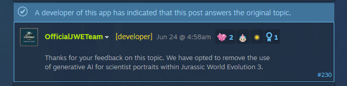 “Thanks for your feedback on this topic,” Frontier said. “We have opted to remove the use of generative AI for scientist portraits within Jurassic World Evolution 3.”