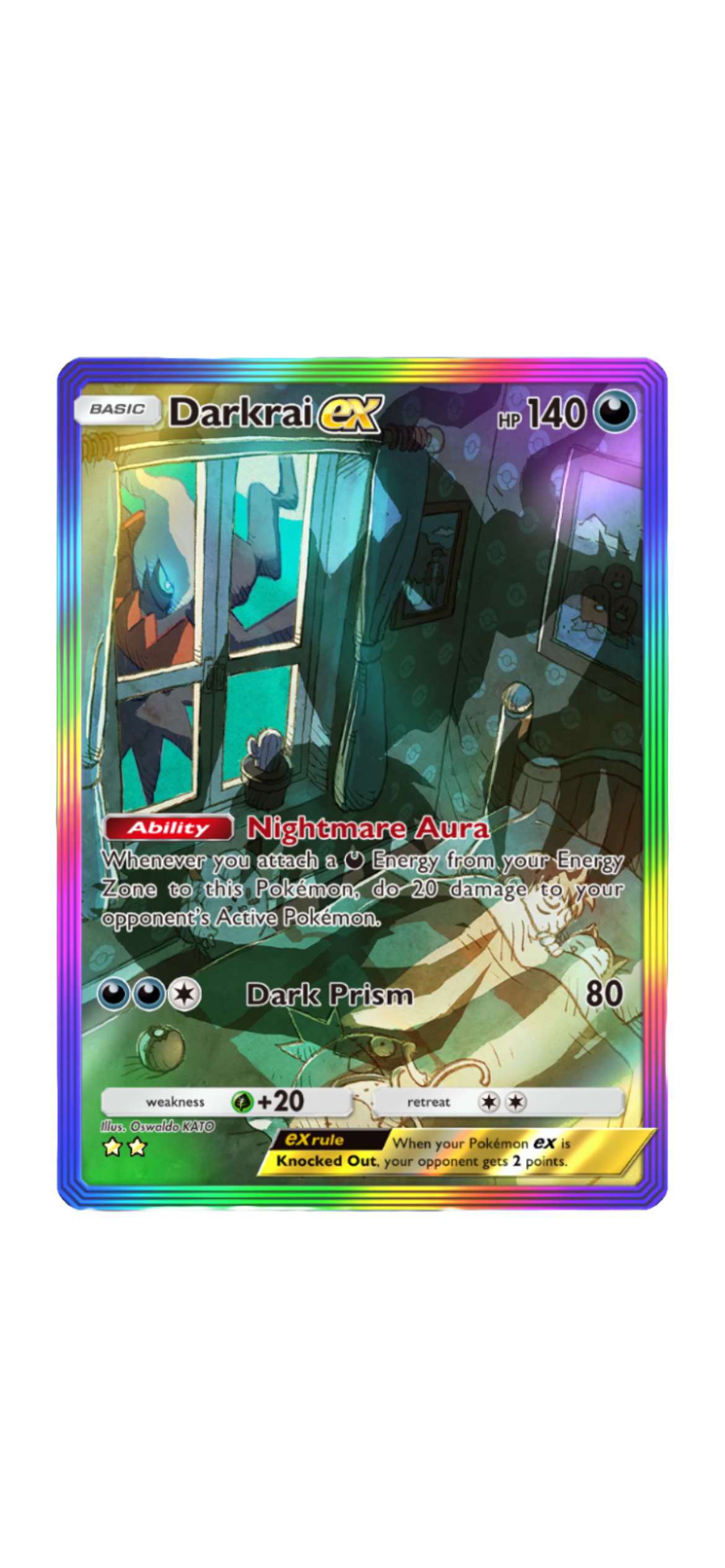 Darkrai ex is a dark-type card with 140 HP and a retreat cost of two energy. It’s a basic Pokémon so you can play it from your hand right when you draw it — no need to worry about evolving it. It has one attack, Dark Prism, which deals 80 damage and it requires three energy in total: two dark-type energy and one more energy of any other type. Eighty damage isn’t anything to scoff at, but that’s not the main draw of this card. What makes it shine is Darkrai ex’s ability, Nightmare Aura.