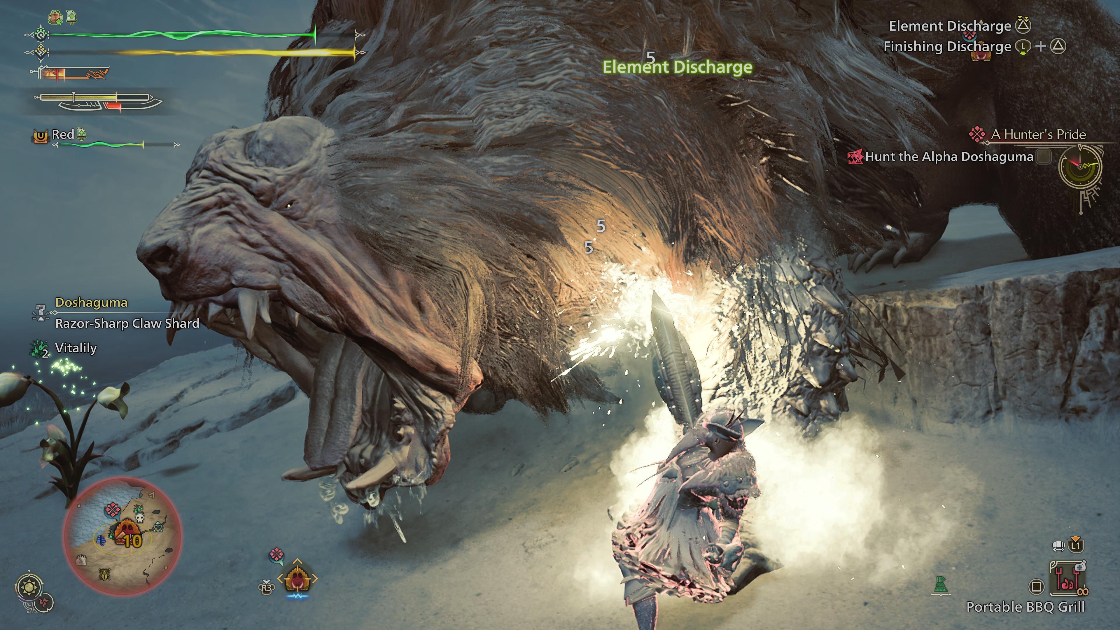 Fighting Doshaguma means constant dodging, to the point where it might take some time until you actually find an opening to strike back. It’s crucial to exploit any visible wounds whenever possible, which can give you the chance to stun it to the ground, exposing the belly, its weak point.