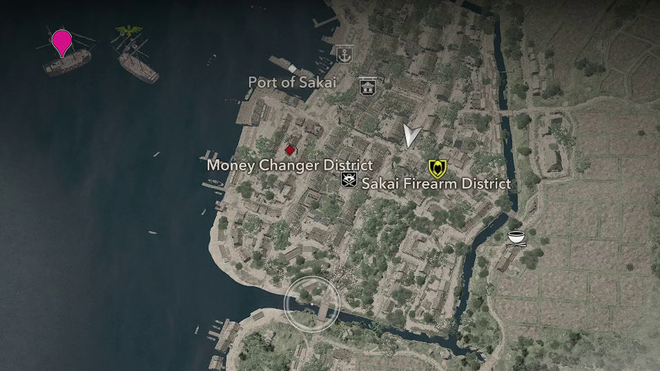Once you have your mission to steal the silk back from the pirates (is it stealing if they’re pirates?), turn around from the merchant and you’ll be face-to-face with the Port of Sakai. Run up to the water and grab one of the small boats. Hop onto it and look out into the bay. You’ll see two large ships (also represented and marked on the map above). Start heading in that direction.