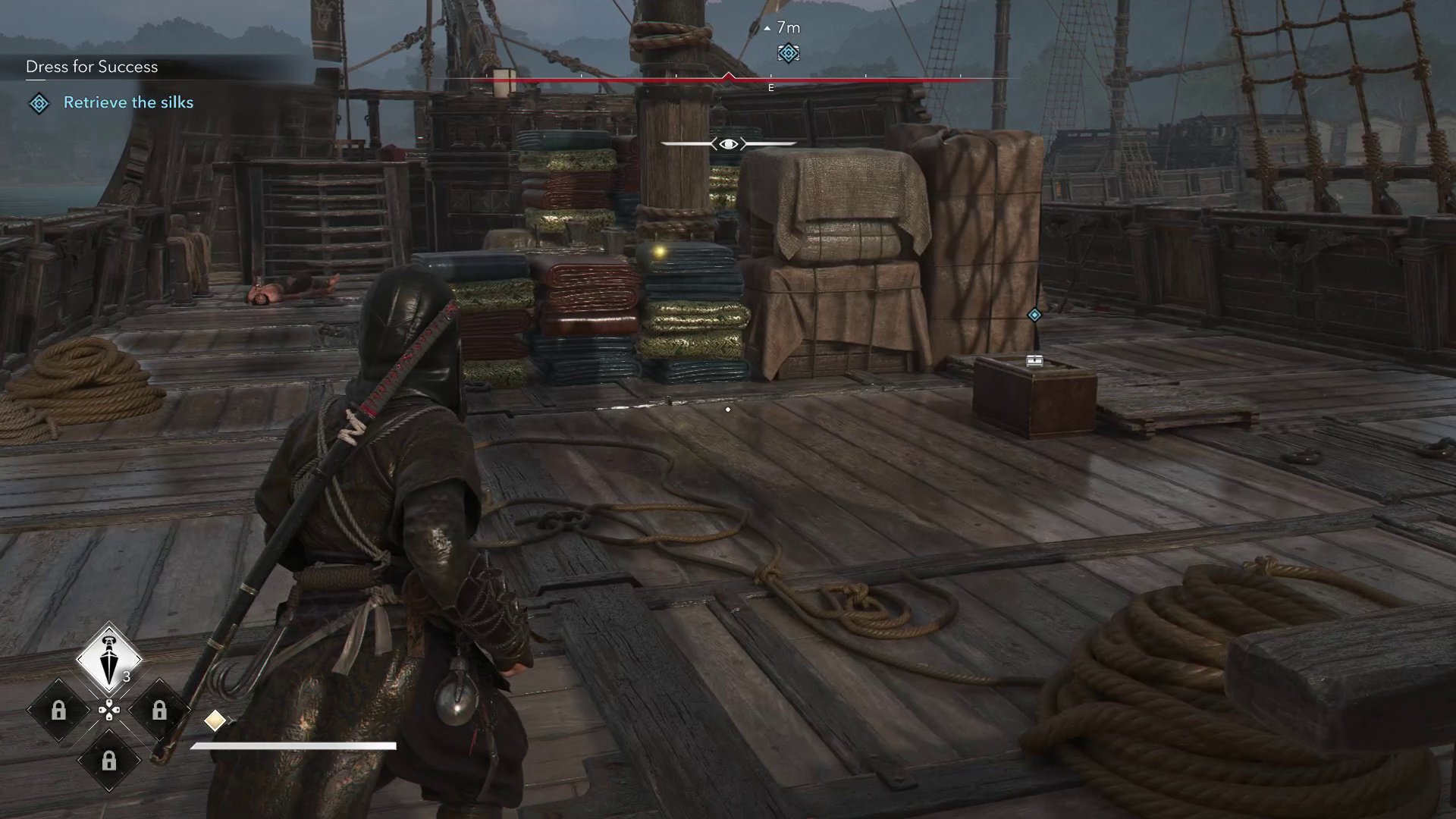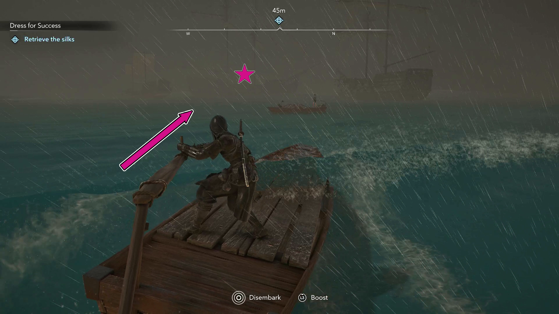 The silk you’re looking for is on the ship to the left (see the annotated image above), but while you’re at it, it’s worth making a quick stop at the ship on the right for a small treasure chest and a synchronization point.