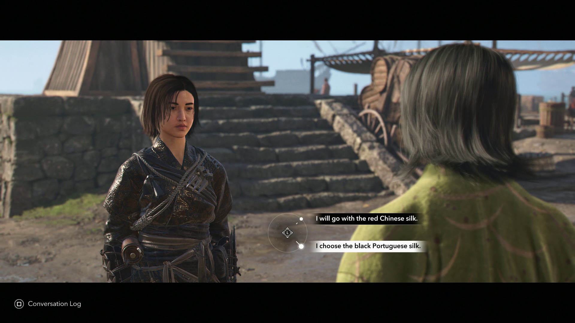 When you return the silk to the merchant, she’ll thank you and offer to make you a special kasode with either Portuguese black silk or Chinese red silk. You’ll then be given a dialogue wheel and told to pick.