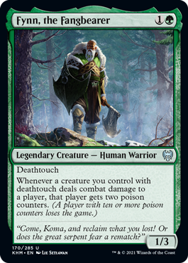 Zooming out to 60-card constructed formats, my mind immediately goes to my pet card from Kaldheim, Fynn, the Fangbearer. His ability lets your deathtouch creatures give the opponent two poison counters if their damage gets through to them, and if someone has 10 or more poison counters, they lose the game. The problem with building a deck around Fynn is that you need an abundance of deathtouching creatures in the deck to pull off the ever-satisfying Infect win. With Venom Connoisseur, the barrier to entry to the deck just lowered considerably and opens up the deck to more colors to play and utility. Utilizing cards that consistently and repeatedly create creatures like Scute Swarm, Join the Dance, Clarion Spirit, or the variety of cards that churn out Decayed Zombie tokens from Midnight Hunt will keep your side of the battlefield full and, more importantly, threatening lethal Infect damage at all times from your fleet of deathtouchers if Fynn is on the board.