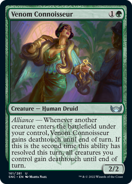 Art by Marta NaelVenom Connoisseur is a 2/2 Human Druid for 1G at Uncommon that uses the ability word “Alliance.” The rules text on the card reads, “Whenever another creature enters the battlefield under your control, Venom Connoisseur gains deathtouch until end of turn. If this is the second time this ability has resolved this turn, all creatures you control gain deathtouch until end of turn.” In the card’s wonderful illustration, artist Marta Nael brings this snake charmer to life.
