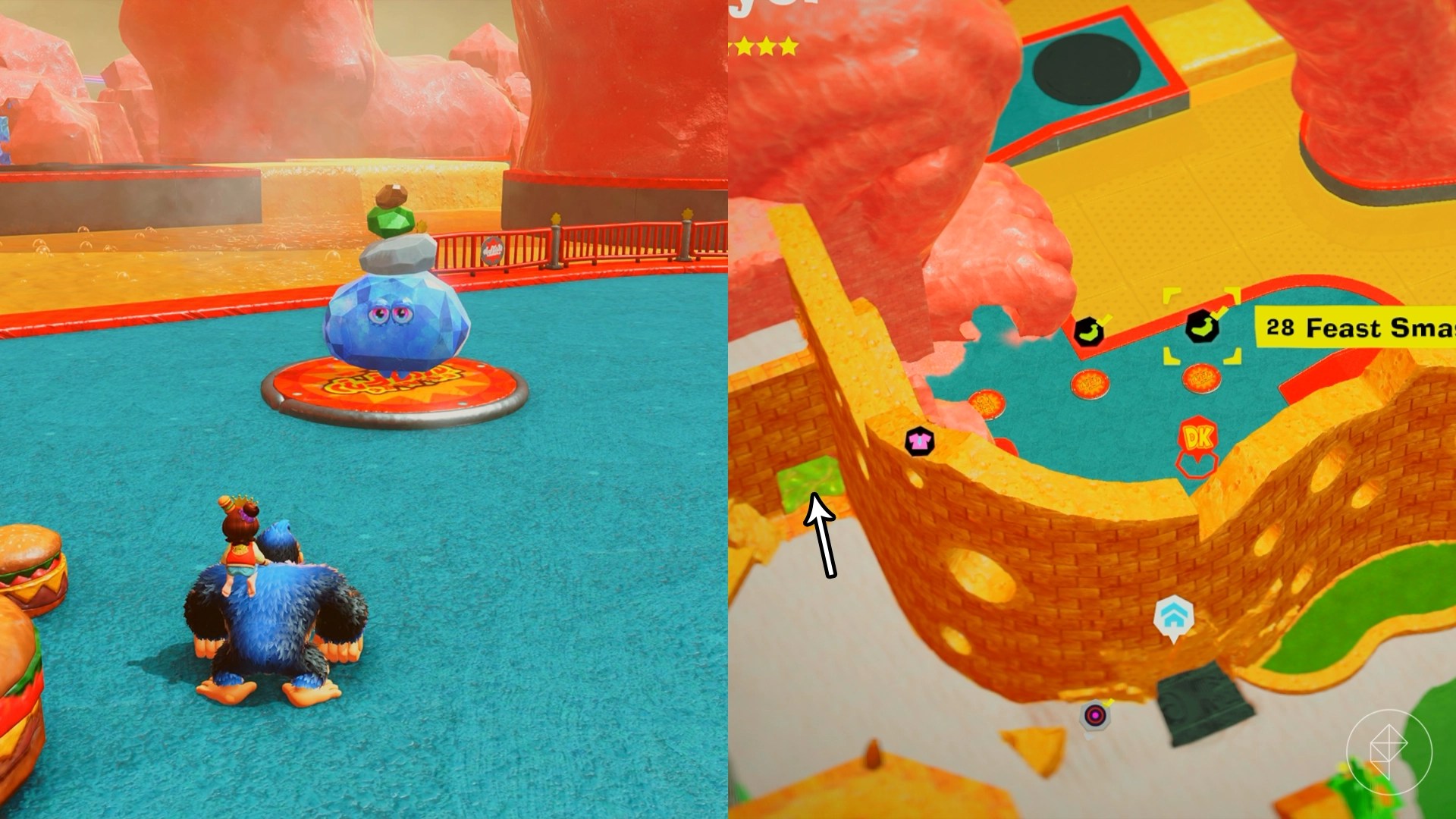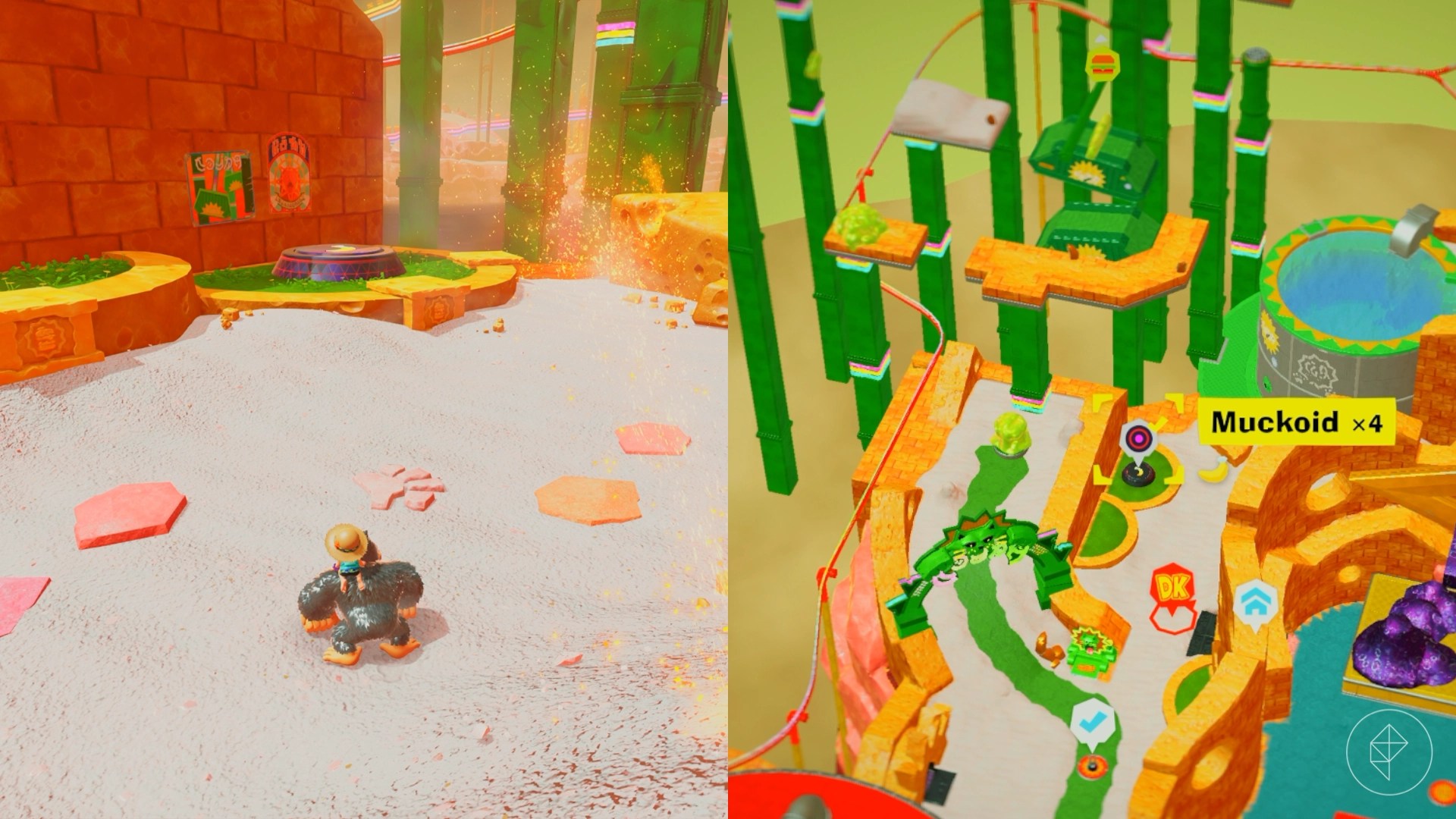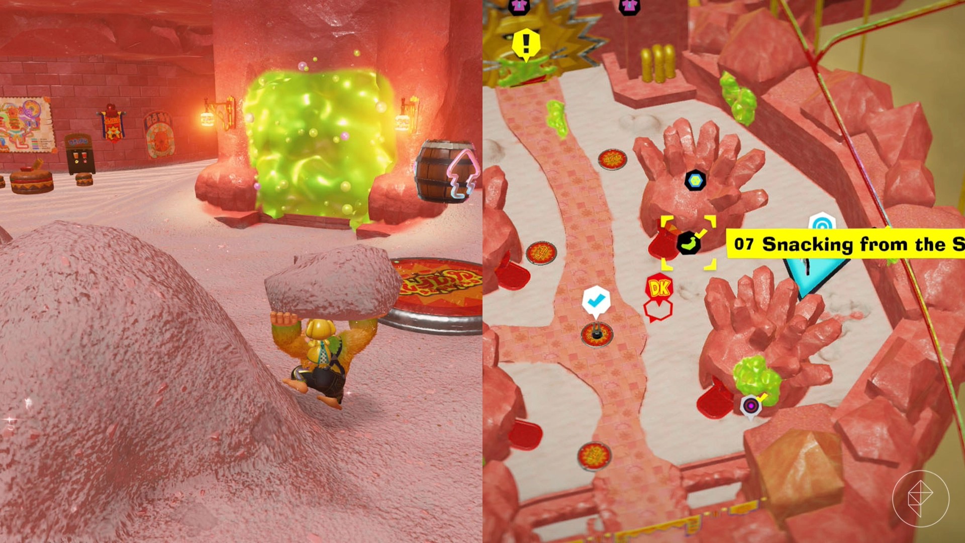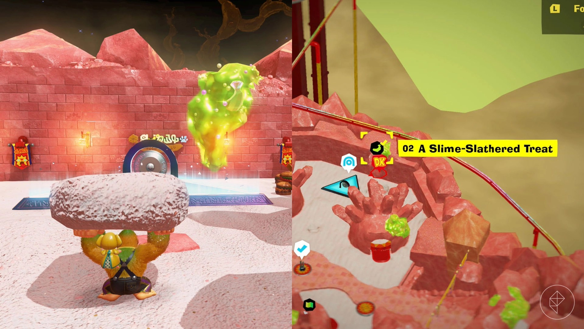 In Donkey Kong Bananza, the 14th layer you’ll go to is the food-filled Feast Layer, an amusement park themed around delicious and greasy food. This place is run by lion-shaped Fractones and has rivers of hot oil, salty sands, and… green nasty muck hanging from the walls? Oh, and a ton of Banandium Gems.