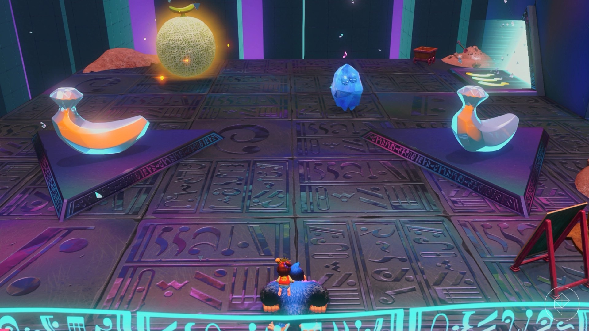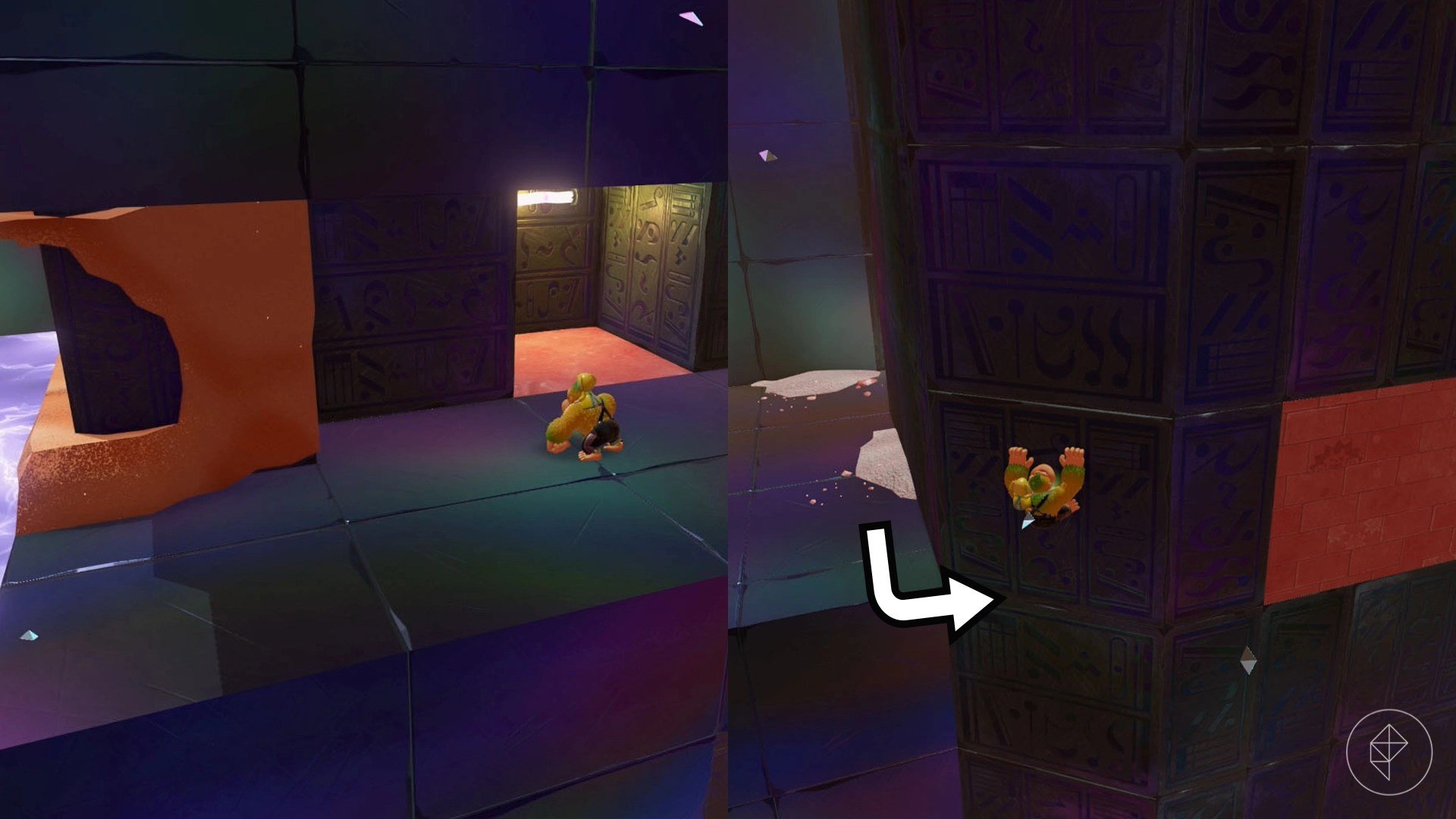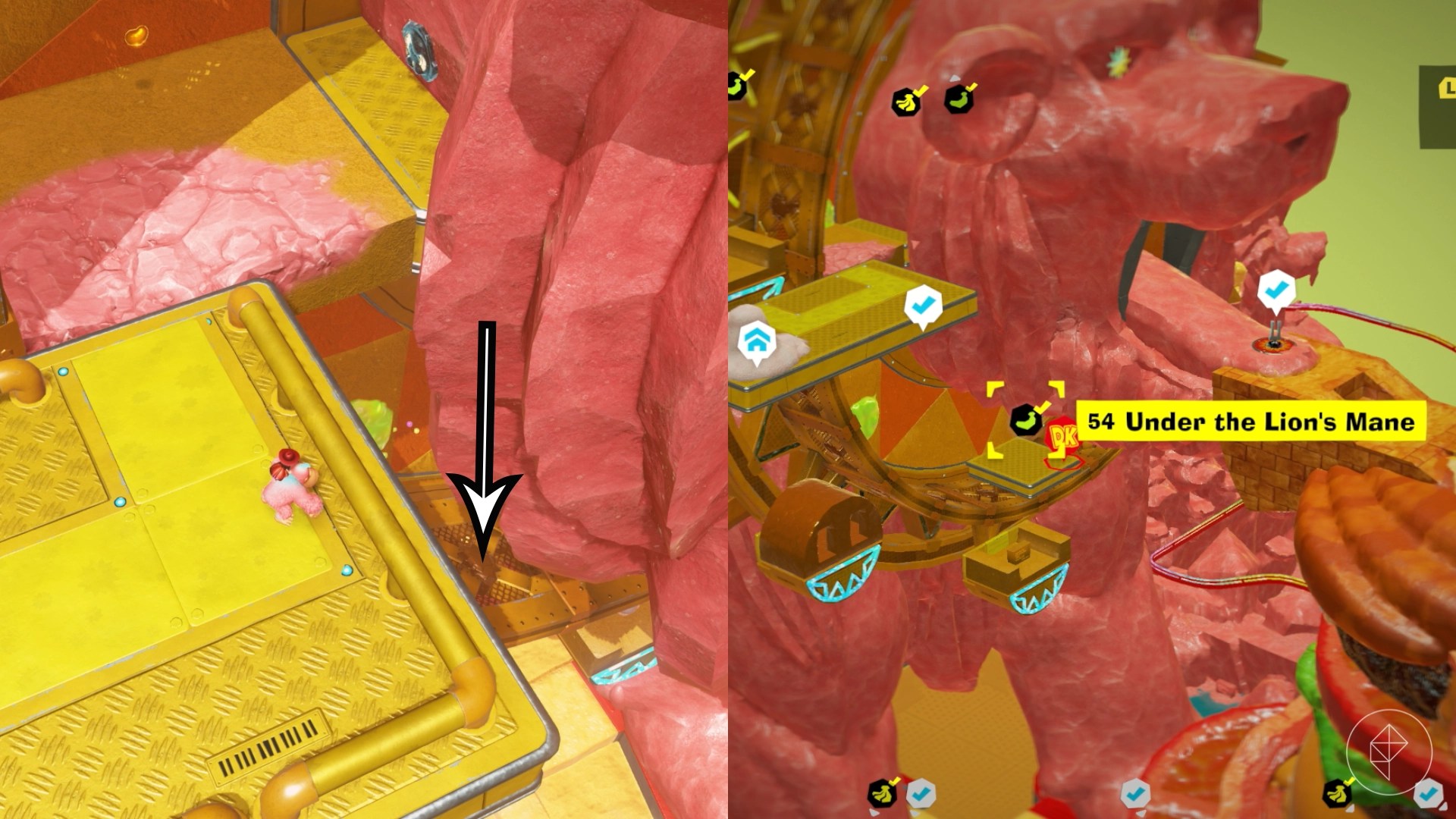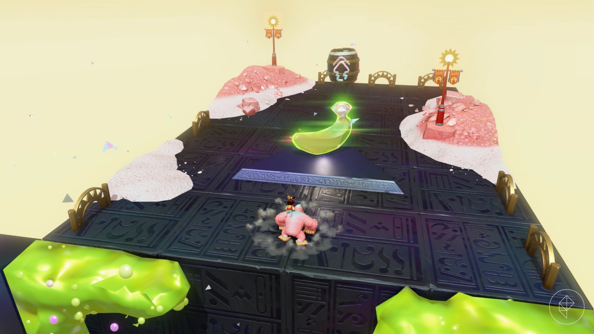 The other two fragments can be found in the lion’s front right paw. Cross the sinking bridge to the front right paw and break the red brick wall to find the two fragments. Similar to the other fragment, you’ll need to periodically jump as you cross the bridge to prevent it from sinking. Bring the two fragments back to the Fragmentone to receive this banana.