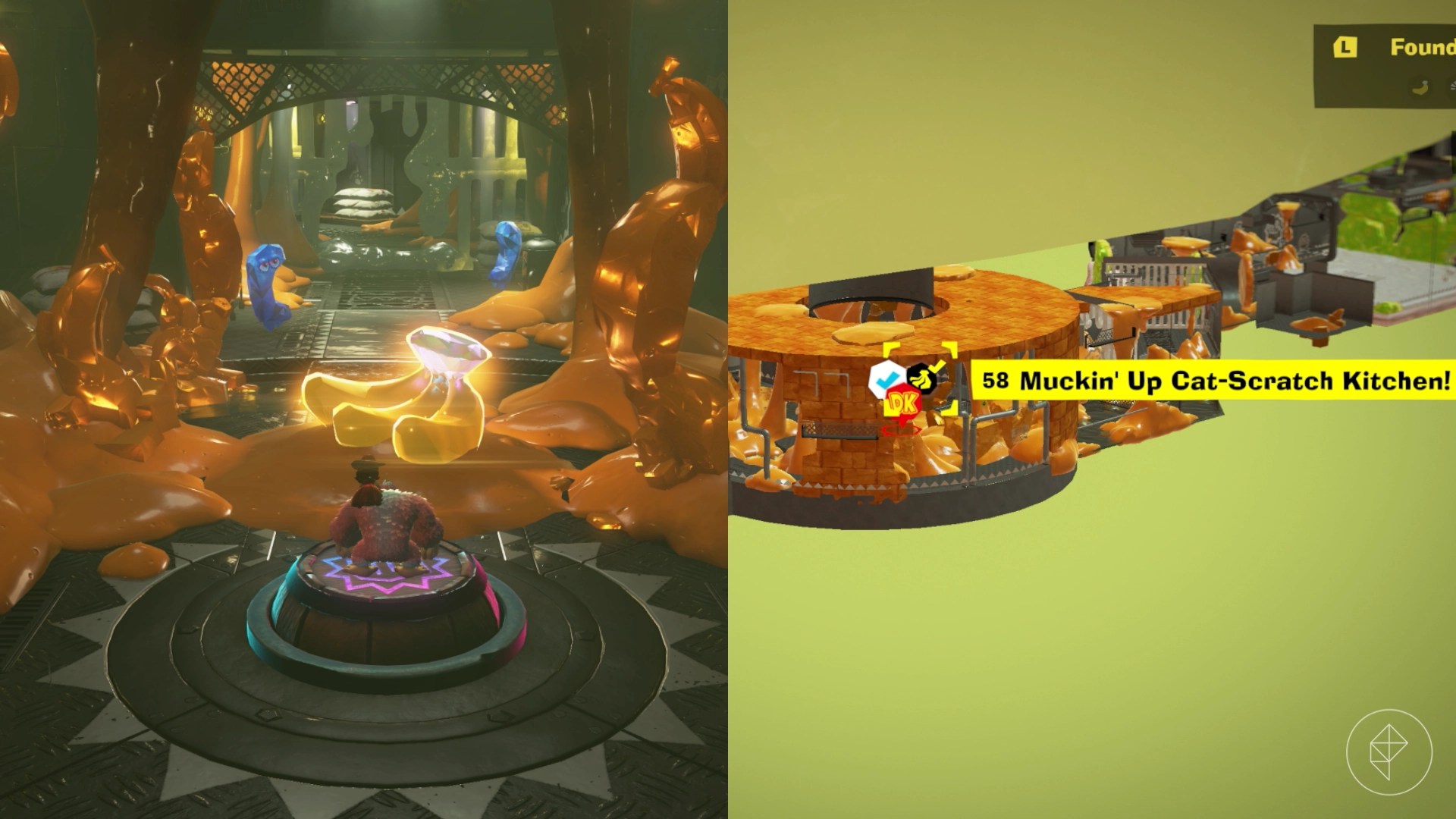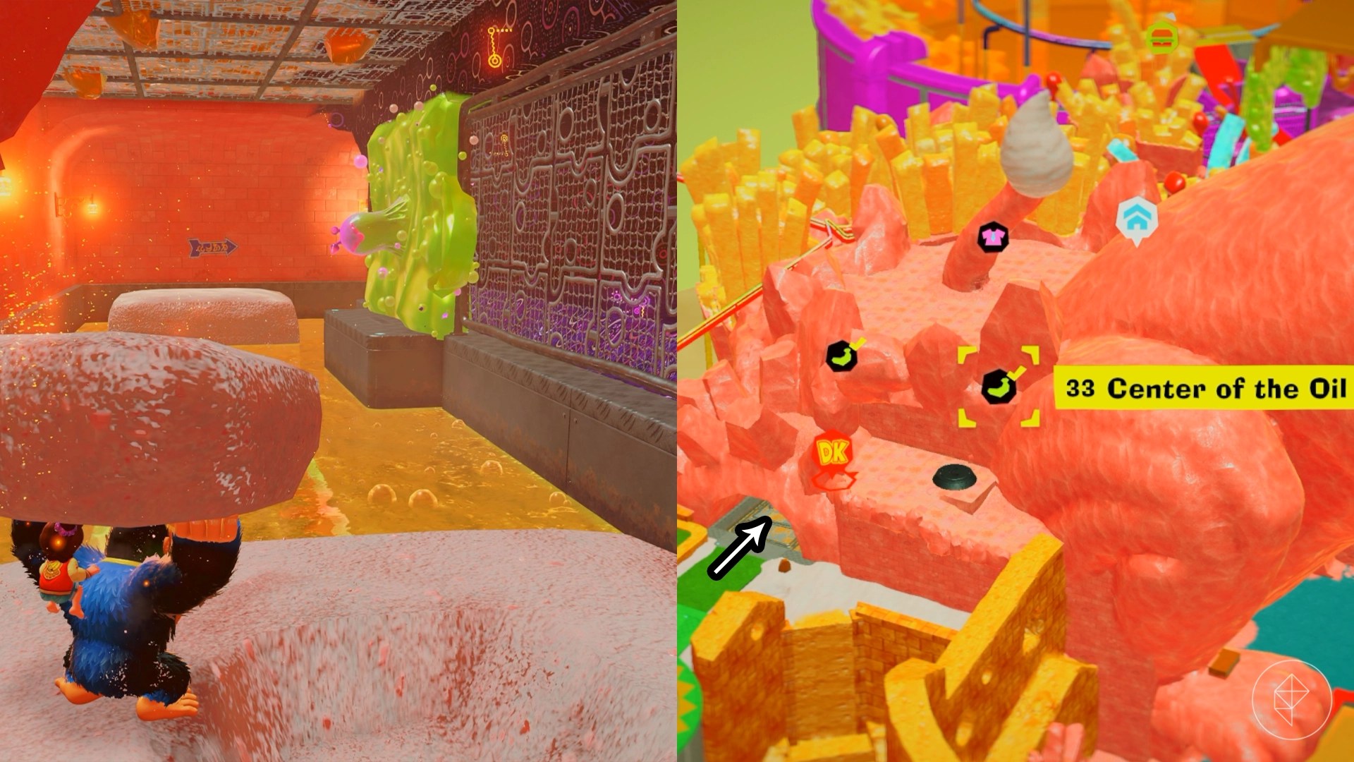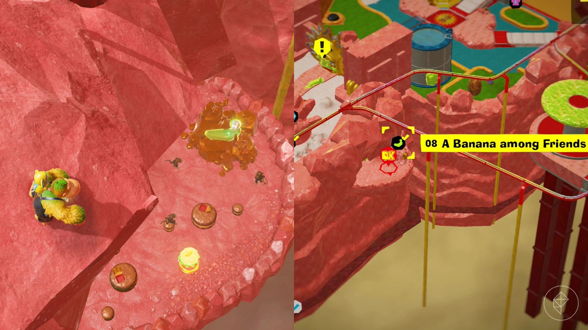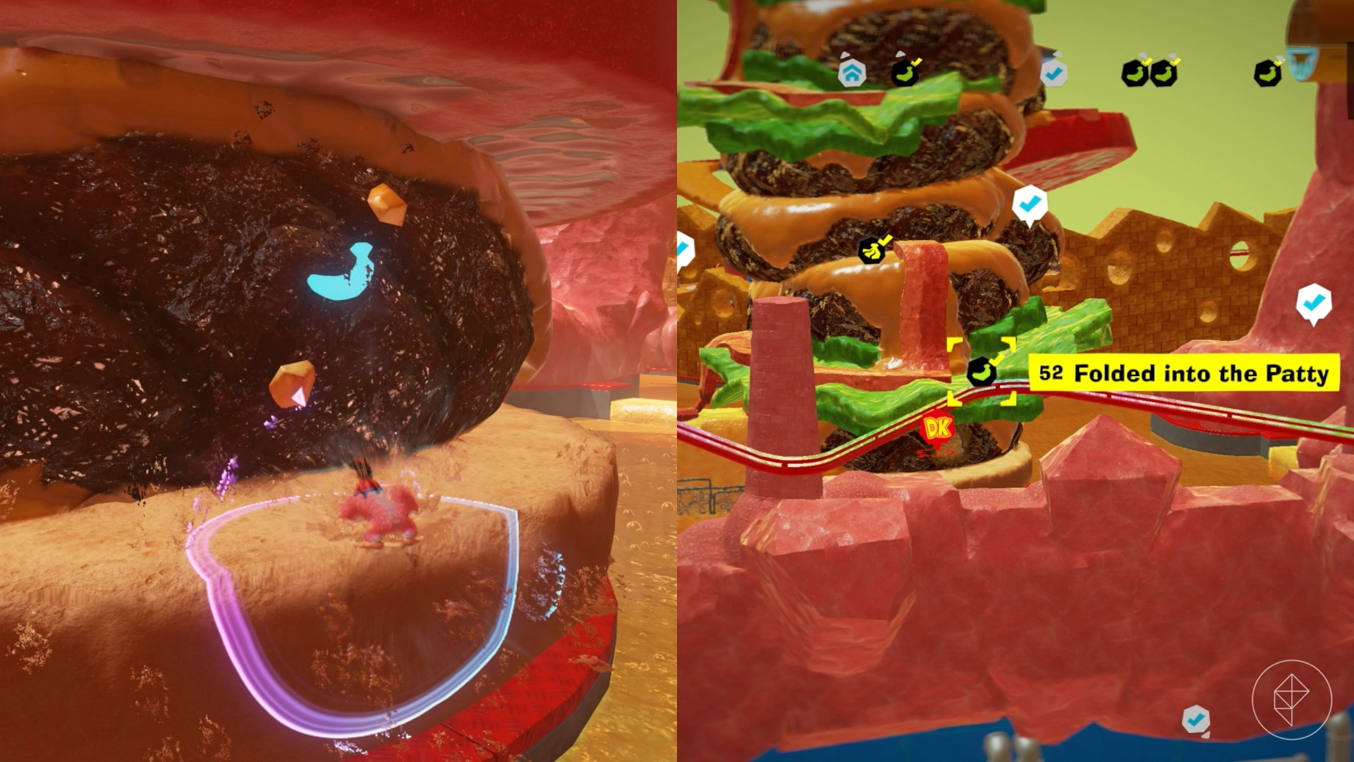 This banana is inside the bottom-most meat paddy of the giant burger. Find it using DK’s Hand Slap sonar and dig carefully around it. If you’ve already cleared up the void goop in the middle of the burger, you may accidentally end up digging straight into the center hole, which will send you to the next sublayer.