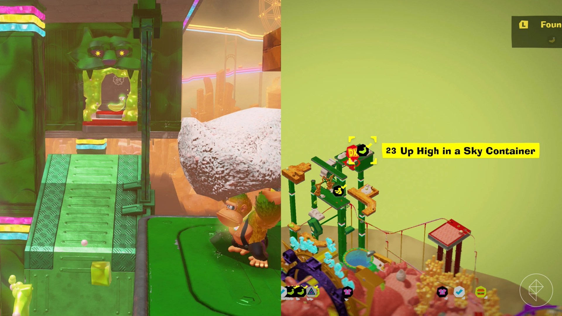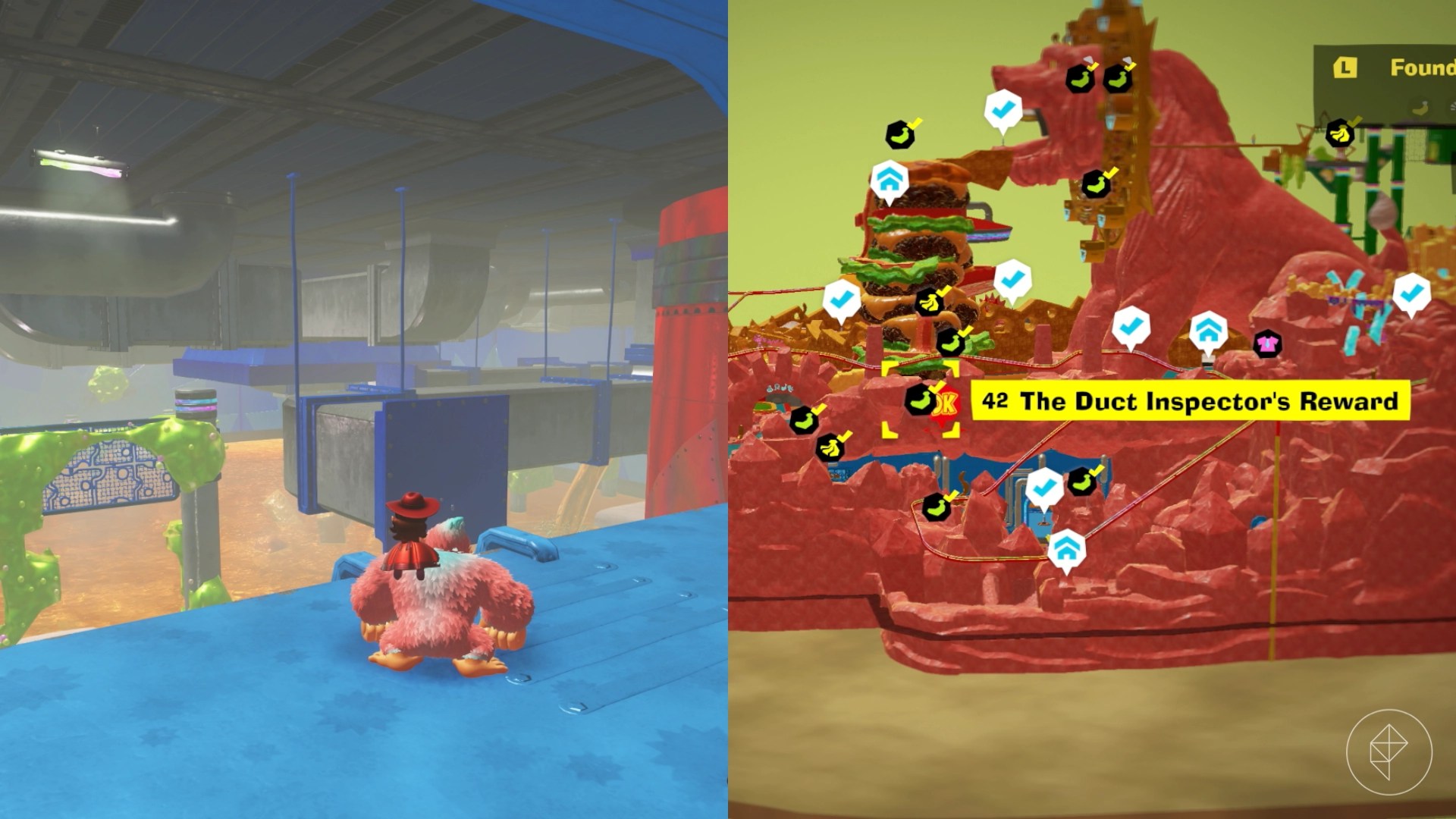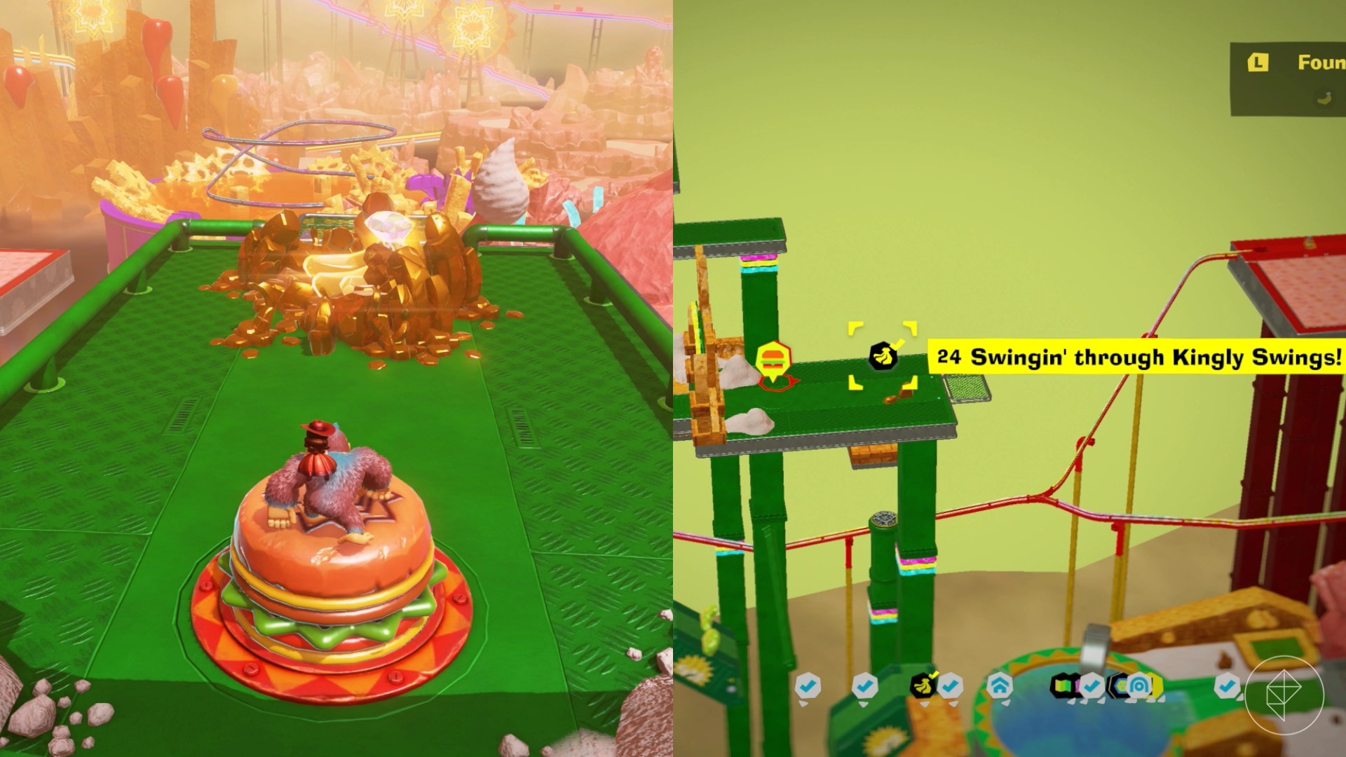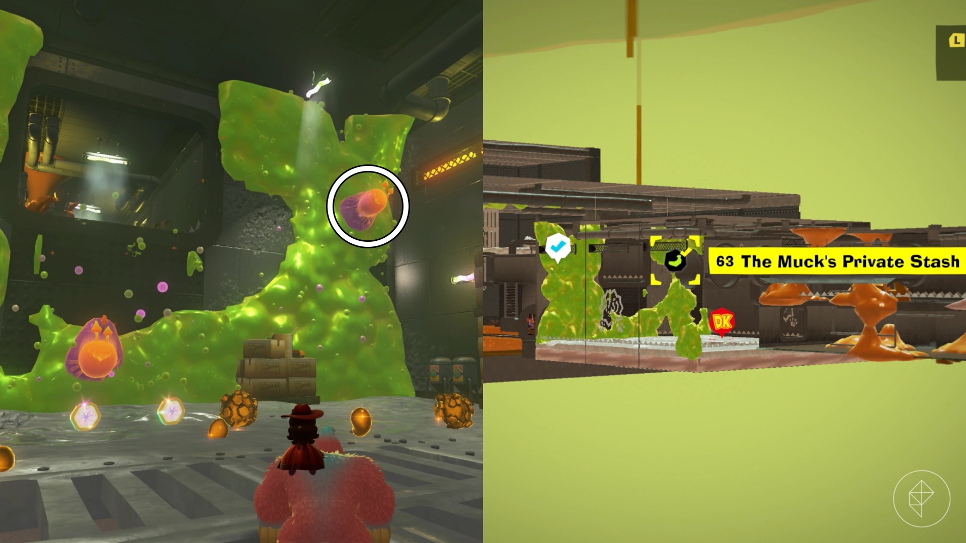 This banana is inside the bottom-most meat paddy of the giant burger. Find it using DK’s Hand Slap sonar and dig carefully around it. If you’ve already cleared up the void goop in the middle of the burger, you may accidentally end up digging straight into the center hole, which will send you to the next sublayer.