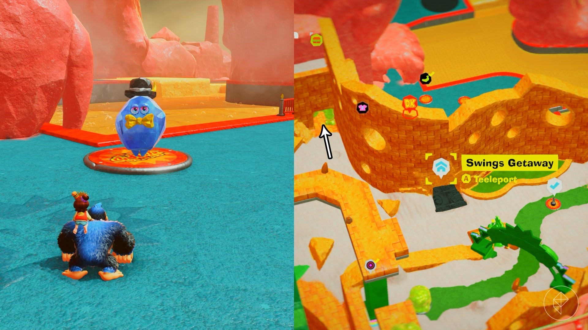 By using one of the two swinging platforms at the end of the Kingly Swings attraction, you can open a door filled with slime. There’s salt in one of the platforms for you to throw at the slime. Once the path is clear, you can go grab this banana.