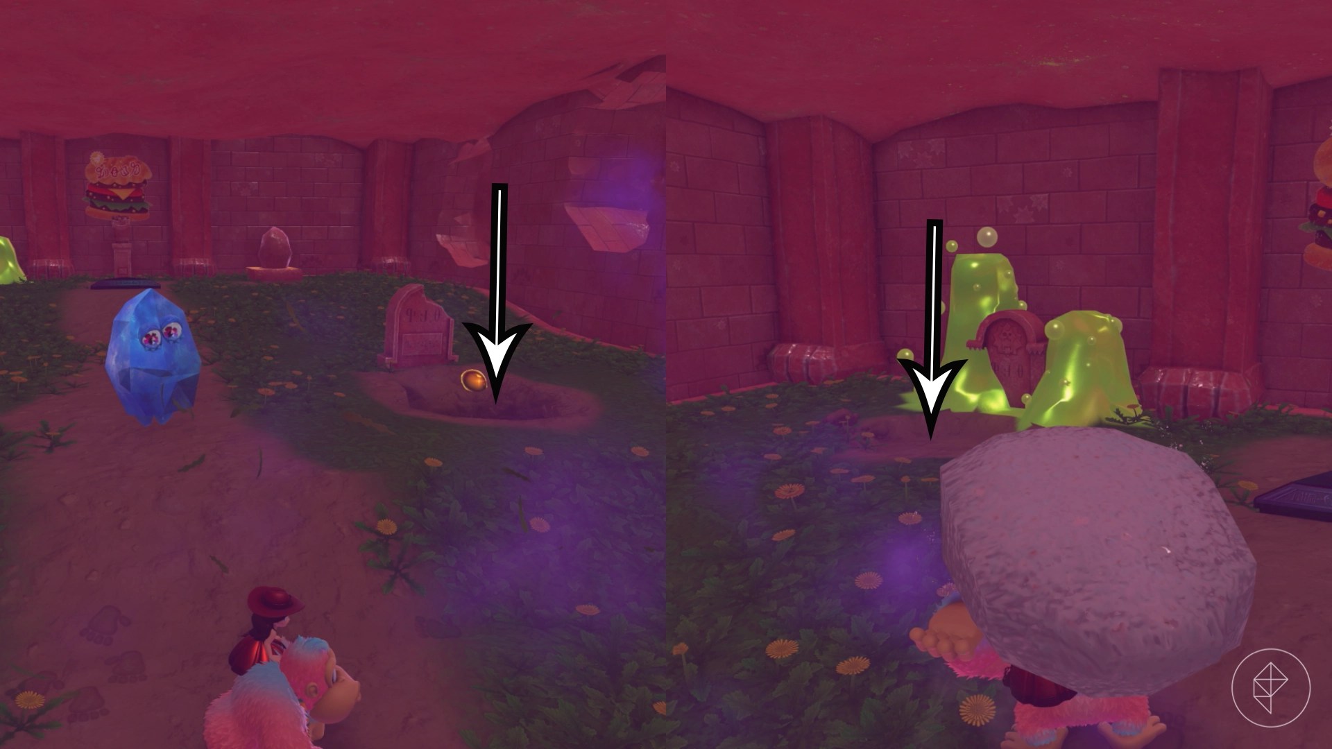 Two of the Fractones aren’t hidden super well, retaining their shapes on the edges of the room. One of the Fractones is “hidden” on a window. Dig under the grave to the right of the Fractone (if you’re facing the pedestal that will hold the Bananadium Gem) to find a salt Fractone that doesn’t count towards the four. Dig down in front of the mucked-up grave and then use a chunk of the salt Fractone to reveal the muck Fractone.