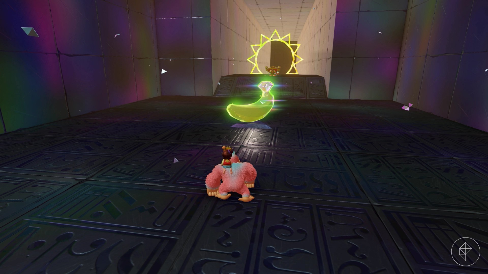 To get this secret banana, you’ll need to make it to the end of the course. Stand on top of this grate where the walls pop out of, charge a jump, and release the jump when a particularly tall wall pops up. You should start to hang from the ceiling, which is where this banana is also hanging.