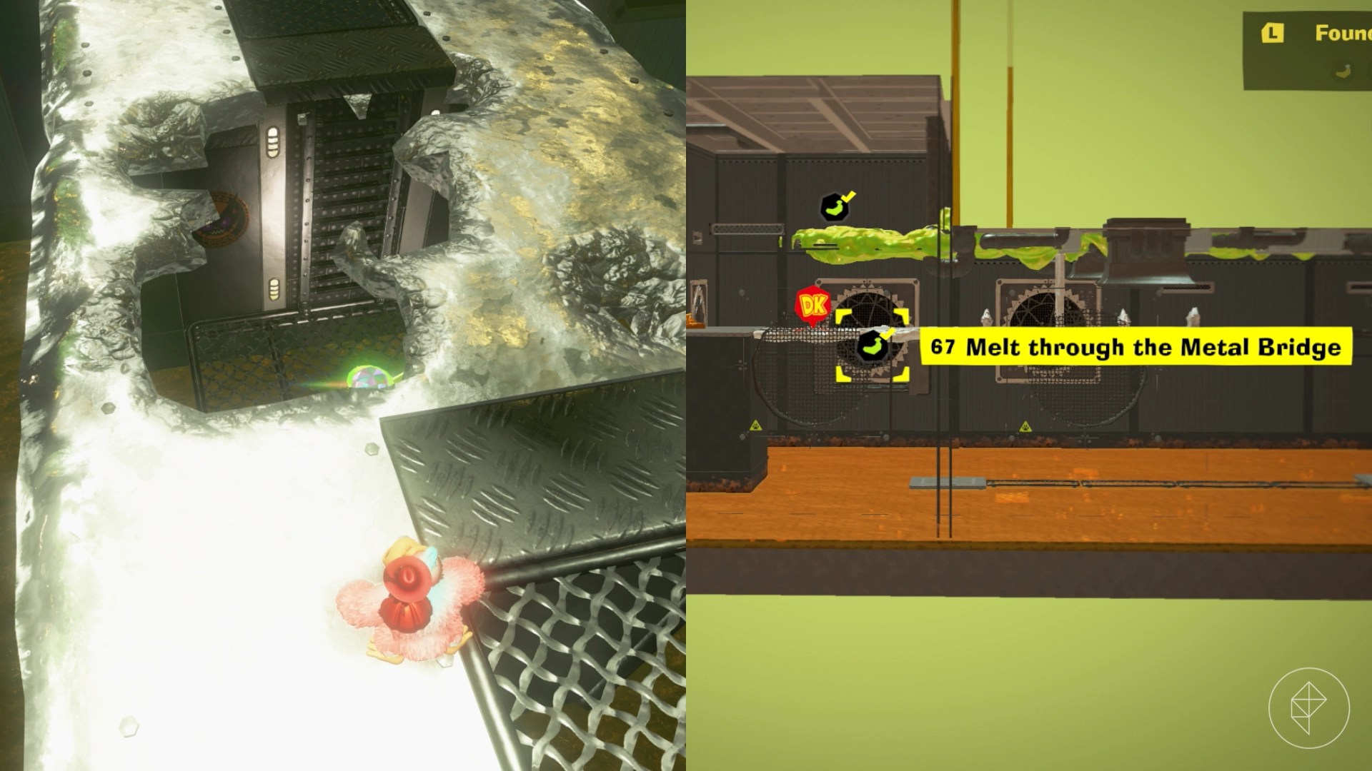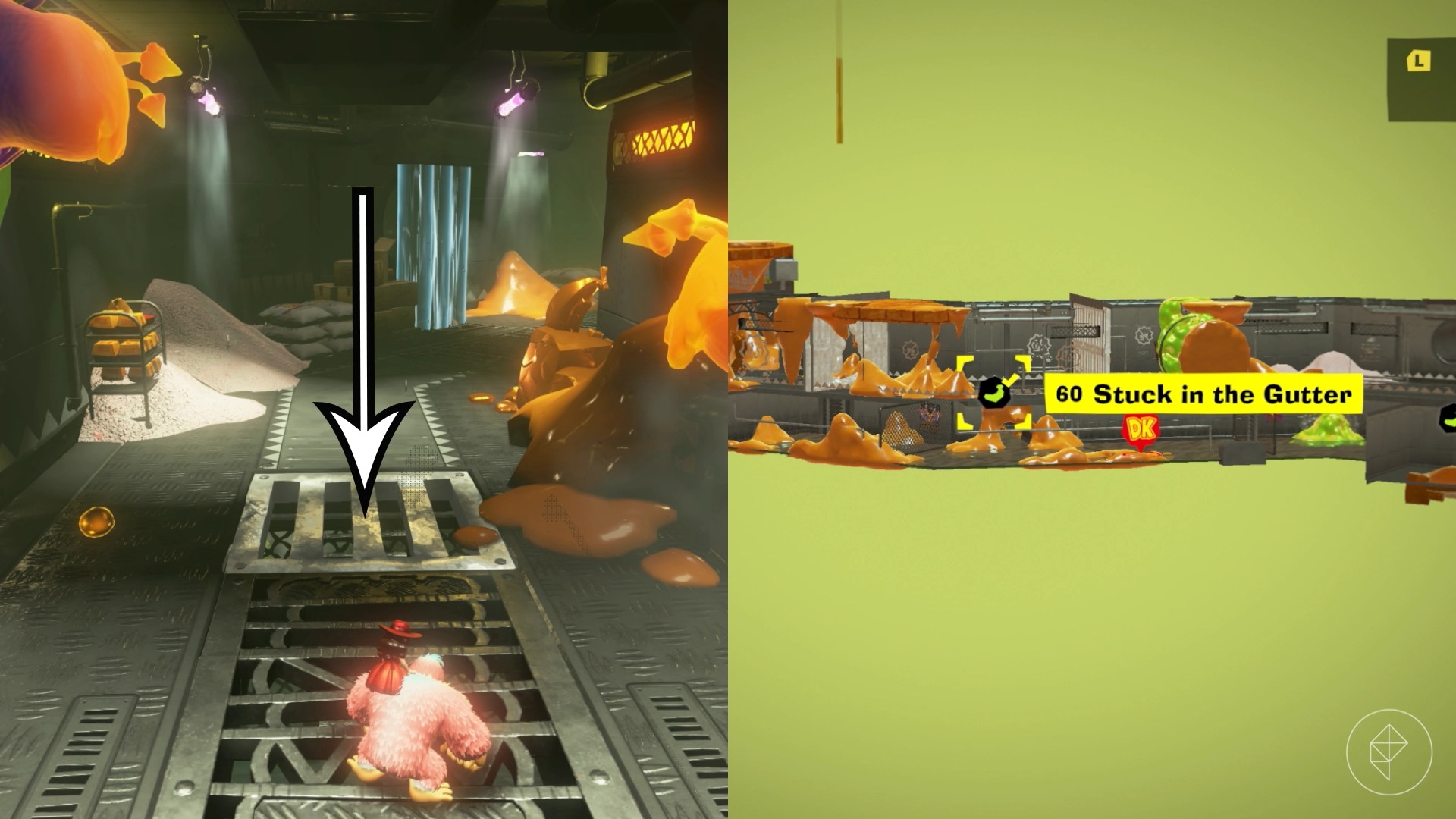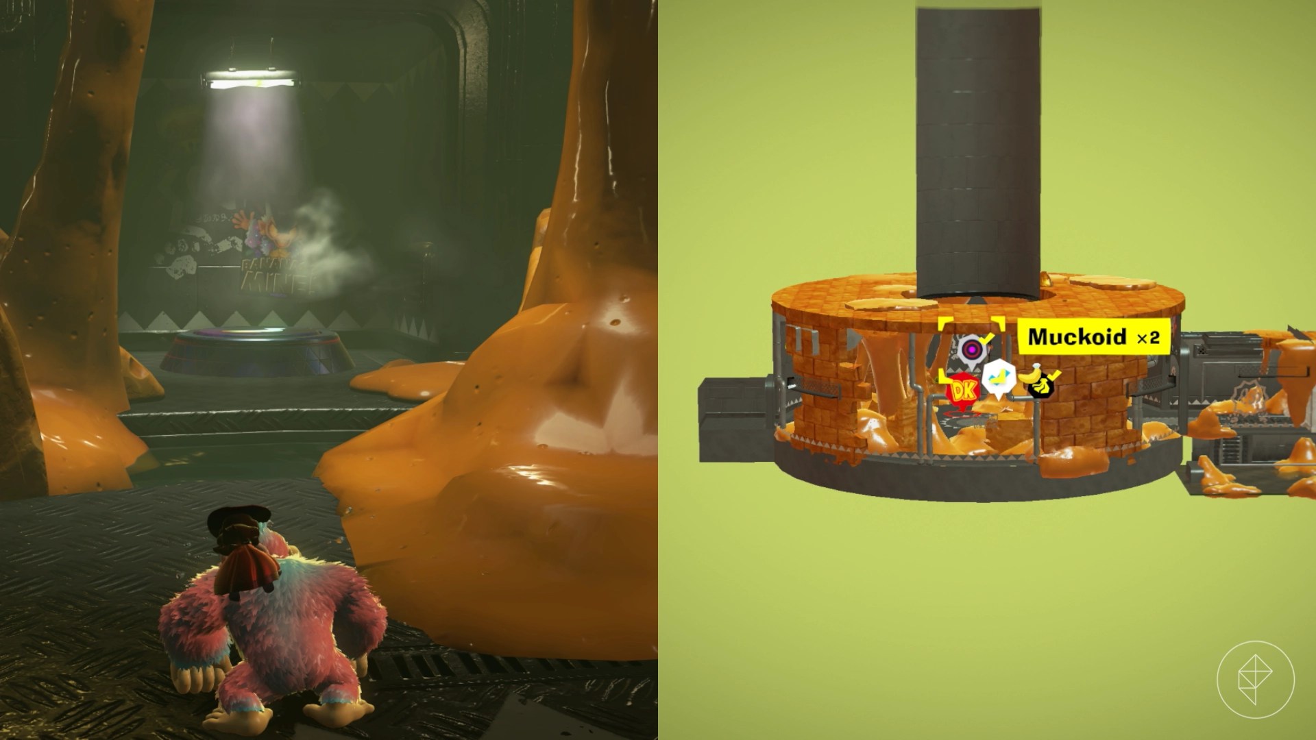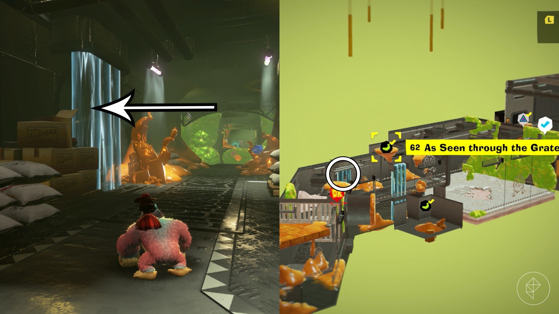 Bait the muckoids into throwing acid on this metal grate and drop in to the opening. Smash through the suspicious wall covered in melty cheese to find this banana.