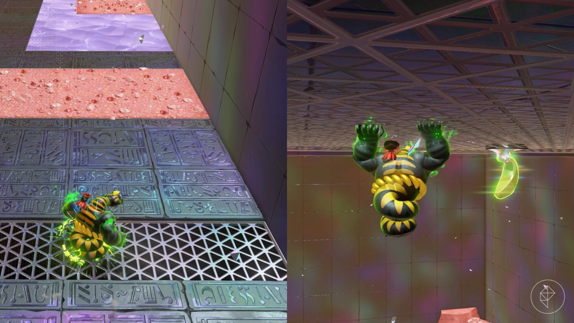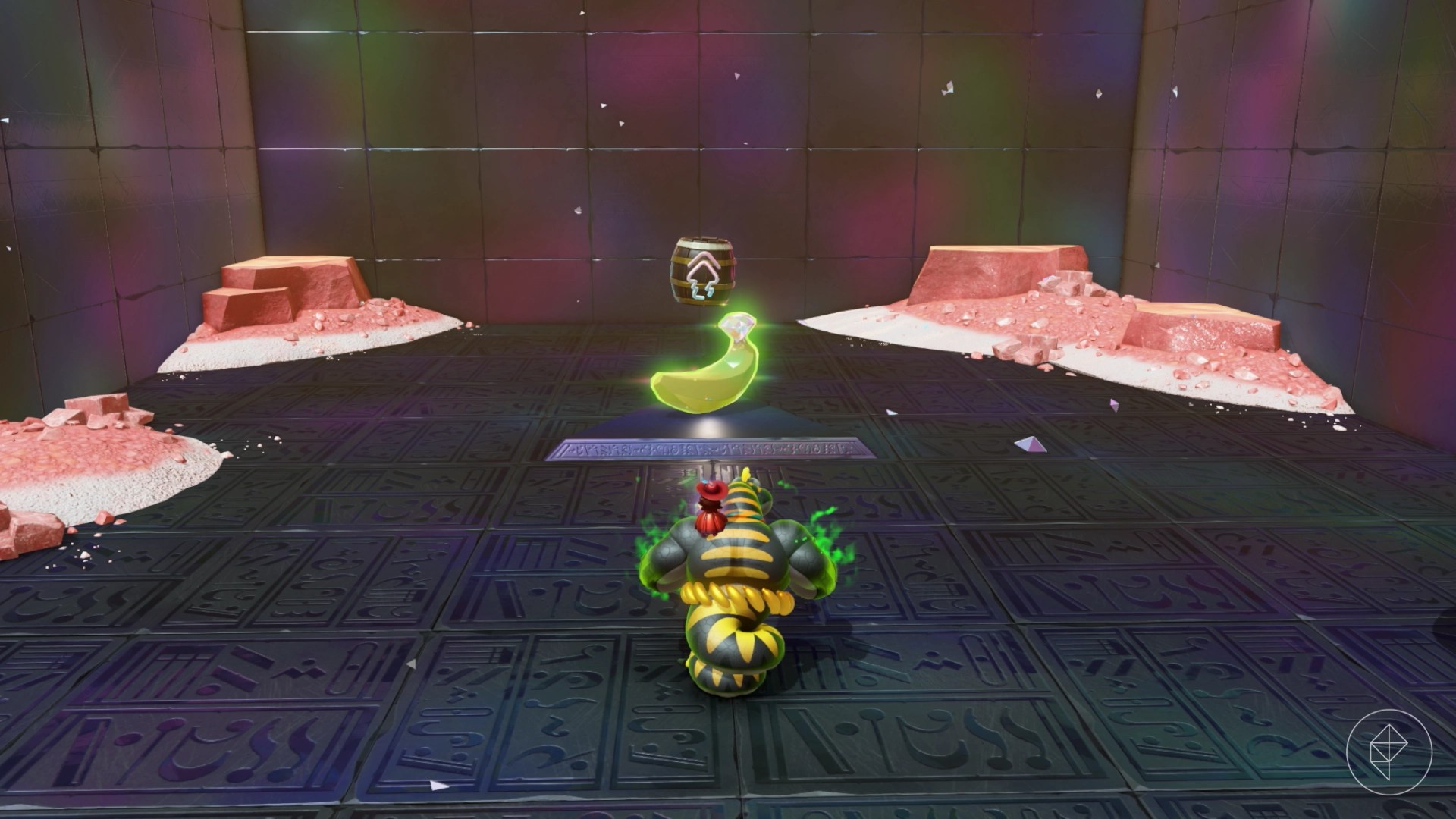 Let the acid-throwing enemies melt away the metal floor in this room to reveal the salt. Use a salt chunk to take out this enemy specifically, which will have a banana behind it.