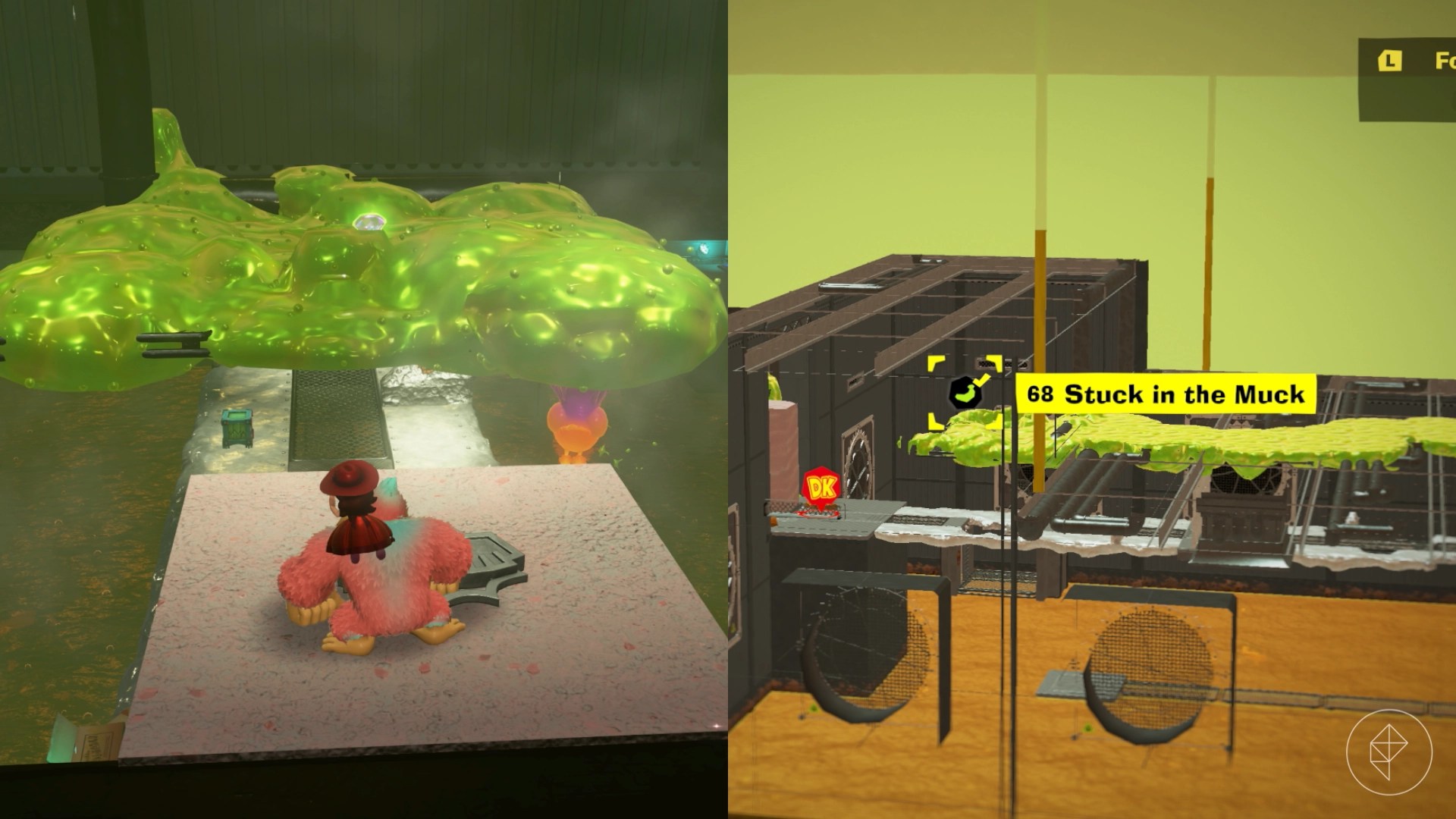 Use DK’s Hand Slap to launch this salt tower up towards the exit of this room, but turn around to see a banana, well, stuck in the muck. Throw chunks of salt at it until it’s safe to jump on to the platform to claim this banana.