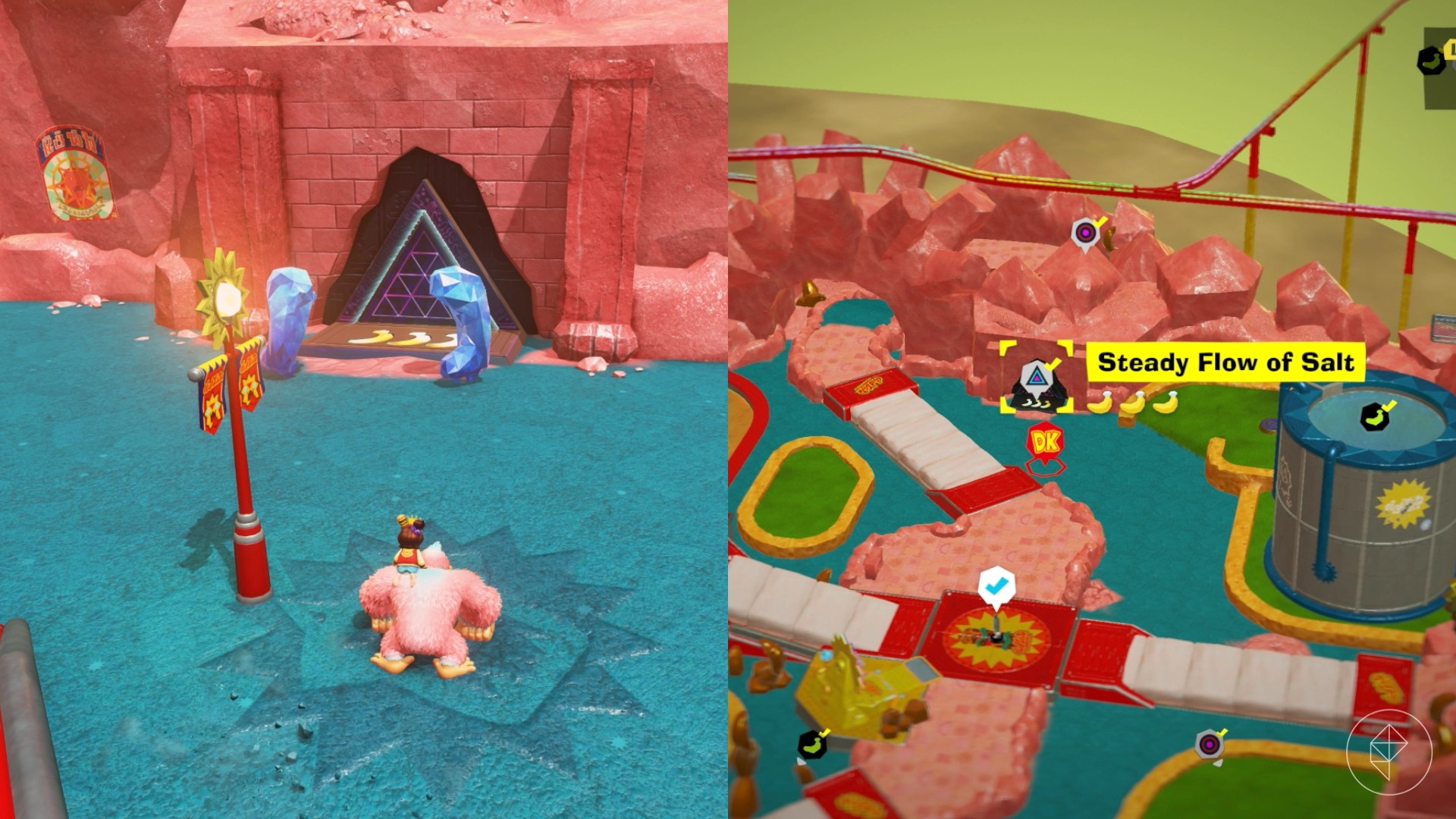 Use DK’s Hand Slap to launch this salt tower up towards the exit of this room, but turn around to see a banana, well, stuck in the muck. Throw chunks of salt at it until it’s safe to jump on to the platform to claim this banana.