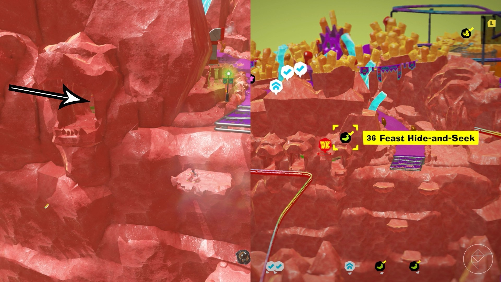 Starting at the Fried Pride Plaza tuning fork, go left in the direction of the battle challenge course you’d completed to obtain the #9 banana in this layer. This time, climb the wall and, on the other side, you will see a platform with some salt. Remove the salt to find this banana.