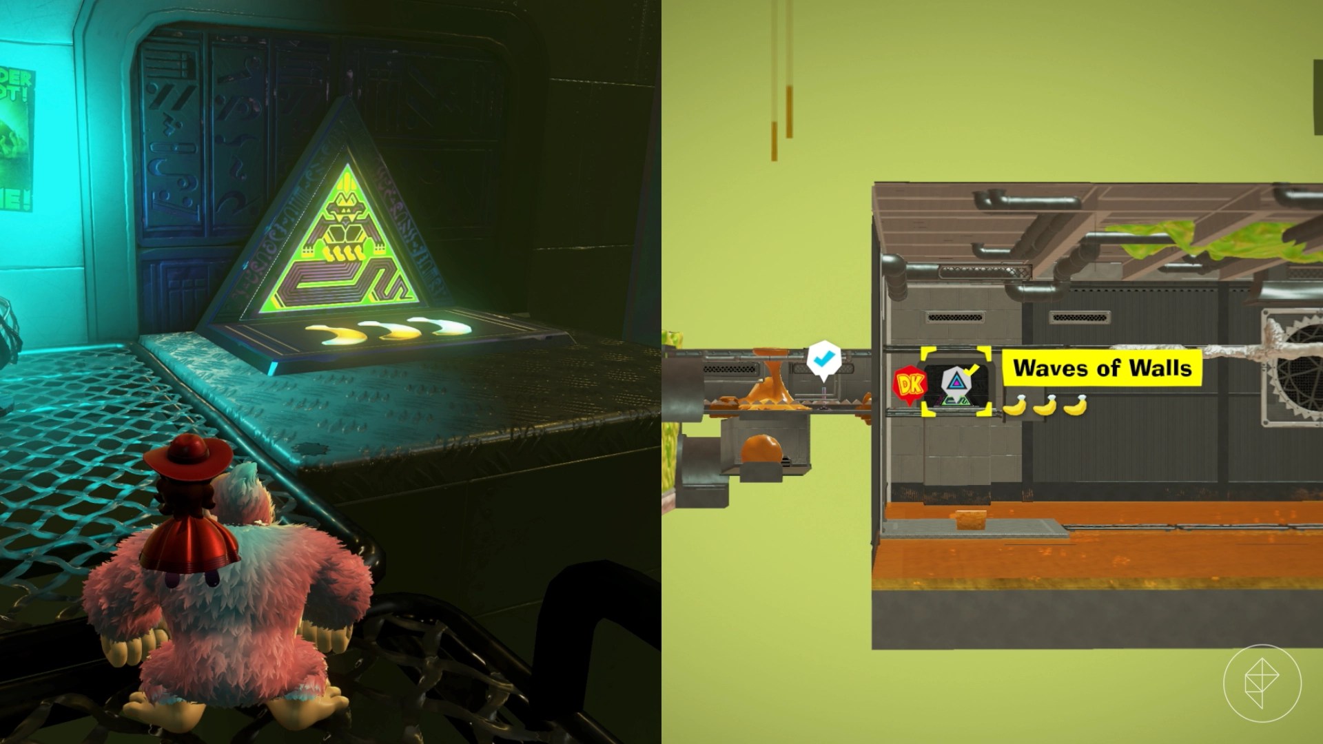 To get this secret banana, you’ll need to make it to the end of the course. Stand on top of this grate where the walls pop out of, charge a jump, and release the jump when a particularly tall wall pops up. You should start to hang from the ceiling, which is where this banana is also hanging.