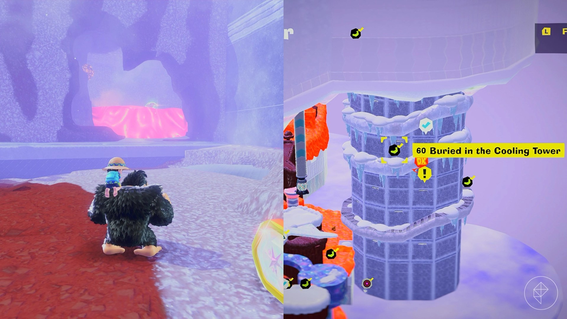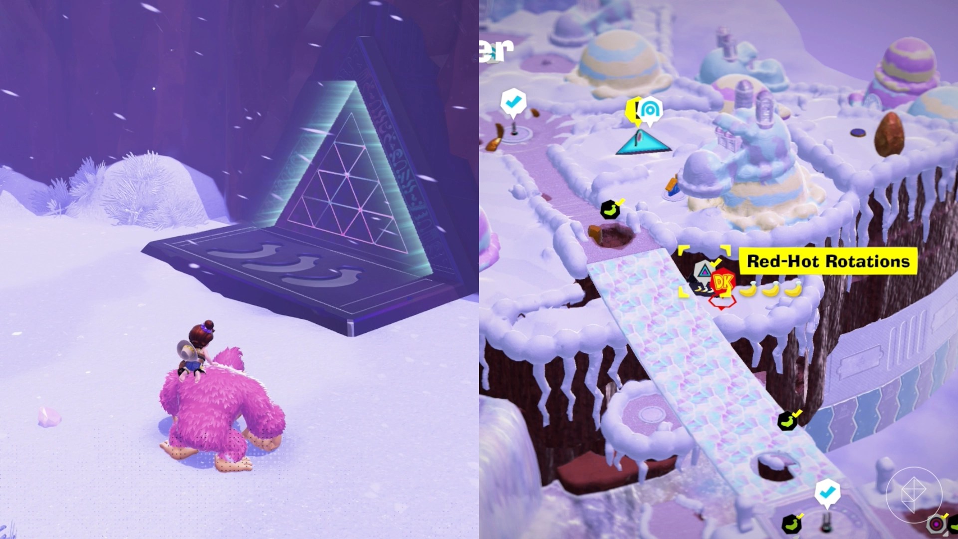 As you reach the end of the path in this early Sublayer 501 area, icicles will fall from the sky, clearing a path to the Ancient Ruin to the right. Inside, you’ll need to defeat four Rolluskoids and use their bodies to remove lava surfaces so you can progress further in. Using the Kong Bananza form makes this challenge a bit easier.