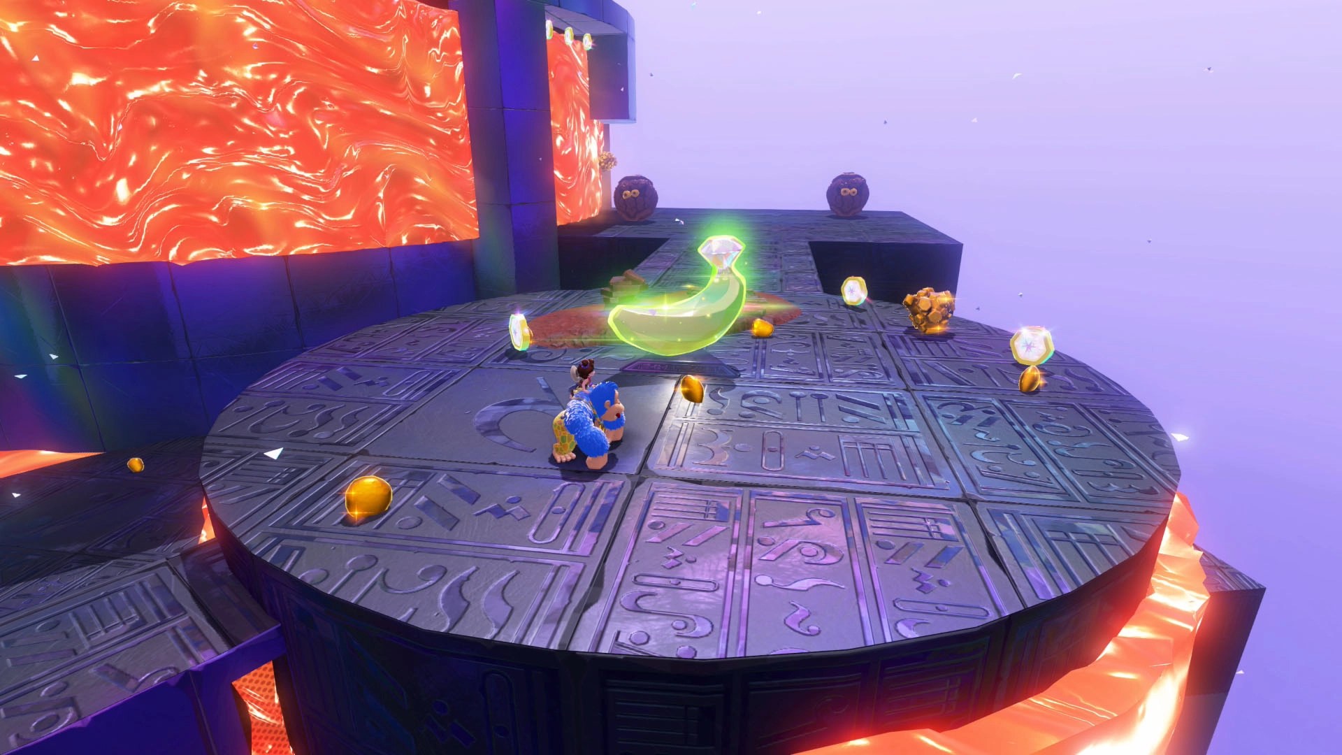 The Banandium Gem is in the middle of a chocolate lava pool. Tear off a piece of hard terrain from the mound around the gem, and Turf Surf to avoid touching the lava. Spin by pressing Y to shatter and collect the gem.