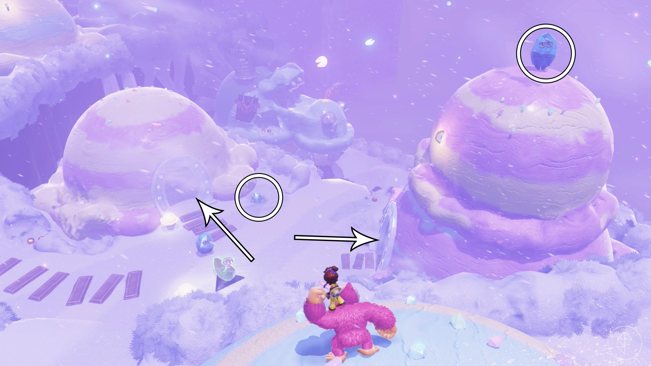 After you teeleport to the Snowy Crossroads tuning fork, turn to the right and head down the hill. Walk past the hide-and-seek Fractones and look over the edge to find a voided Banandium Gem along with a few crockoids. Follow the purple path into the house and destroy the strange seal. Return back outside, defeat the crockoids, and collect your banana.