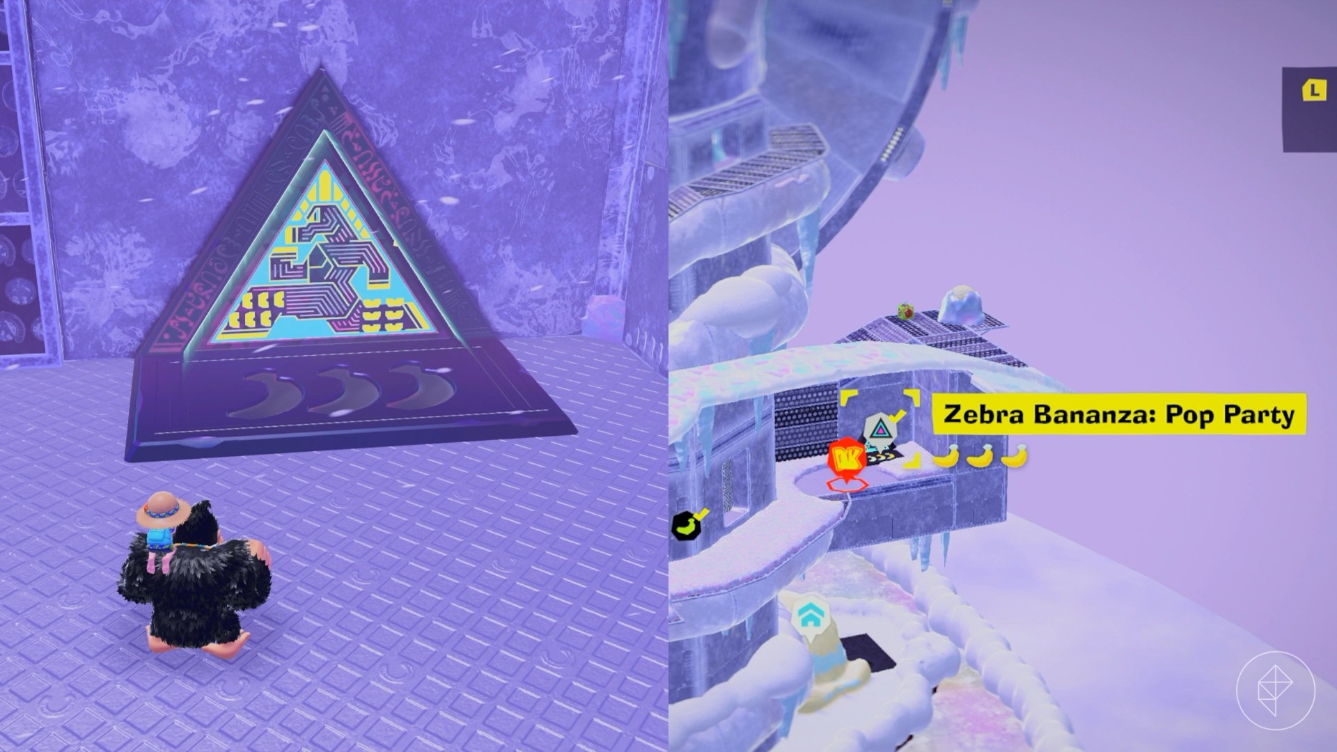 After you acquired the Zebra bananza, go back to the Coolstripe Cavern tuning fork. Turn around and walk on the straight path forward back into the cave until you see the platform you can raise by clapping. Head up this platform and you’ll find a ramp that will take you to the top of the cavern. Look for the floating triangle to start the Shifty Smash challenge. You’ll receive the banana as a reward for completing it.