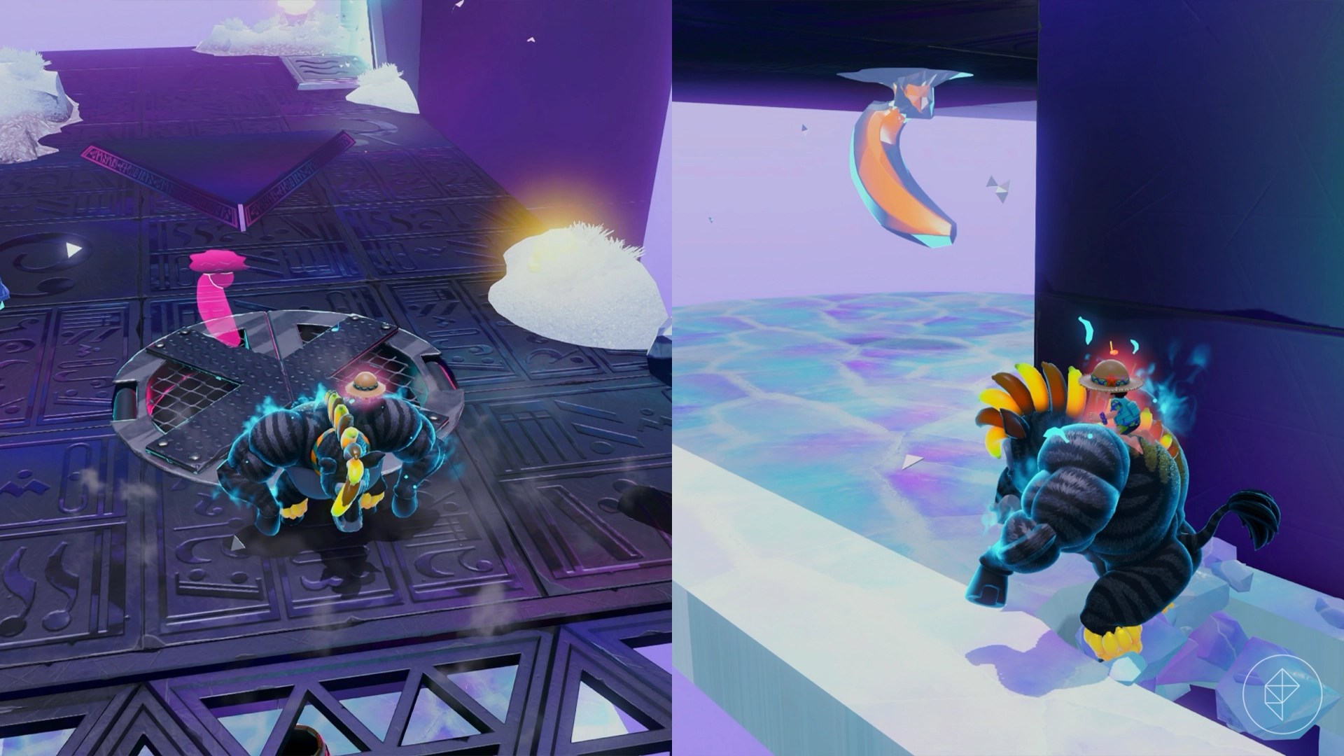 When facing the Zebra Elder, turn to the right and follow the path upwards. On your right, you’ll find six pullable fruit along with one fruit in the middle of a pool of lava. Uproot one of the fruit on the sides to reveal an ice cube. Using the ice cube, turf surf to the middle fruit and pull it out of the ground to reveal a hole. Drop down to find a rotating tunnel whose walls are covered in lava and a block of ice beside it. Break off a piece of ice and Turf Surf over to the banana on the other side.