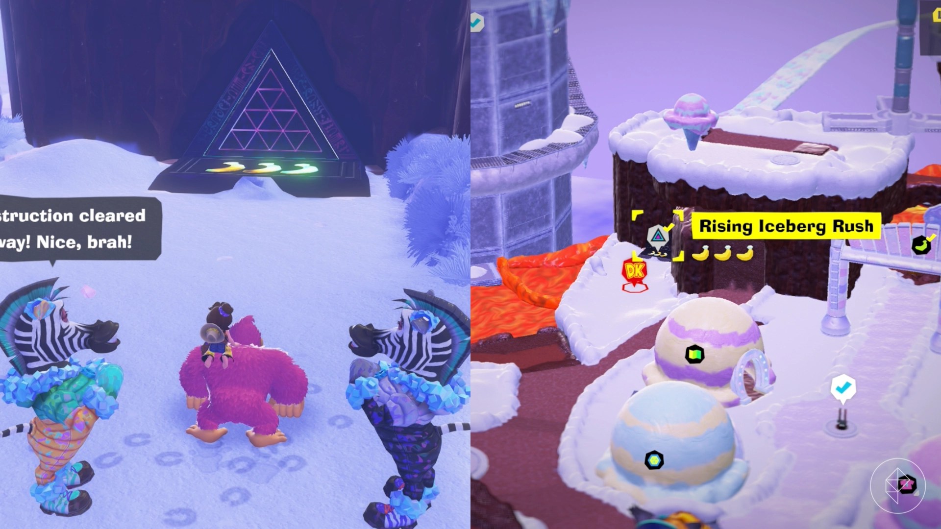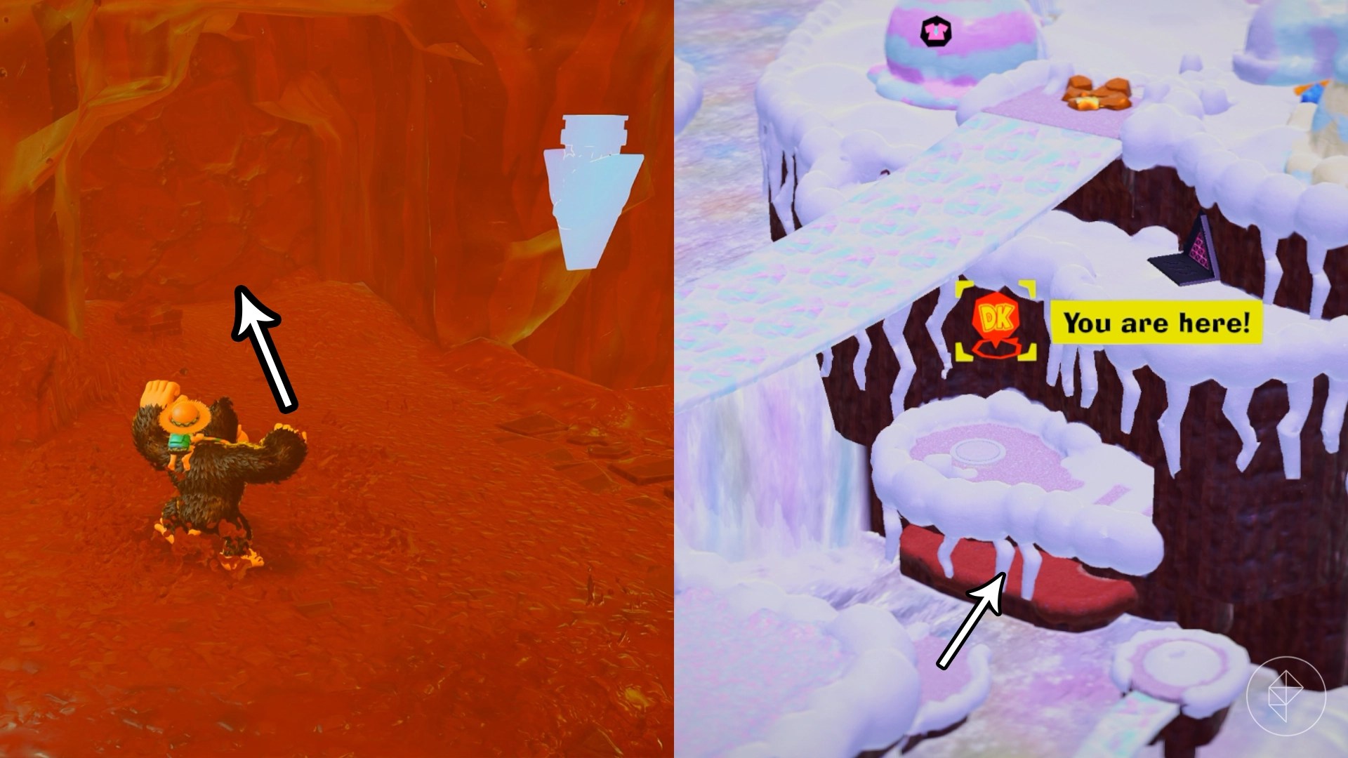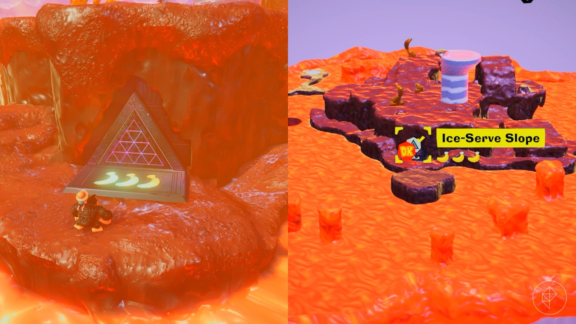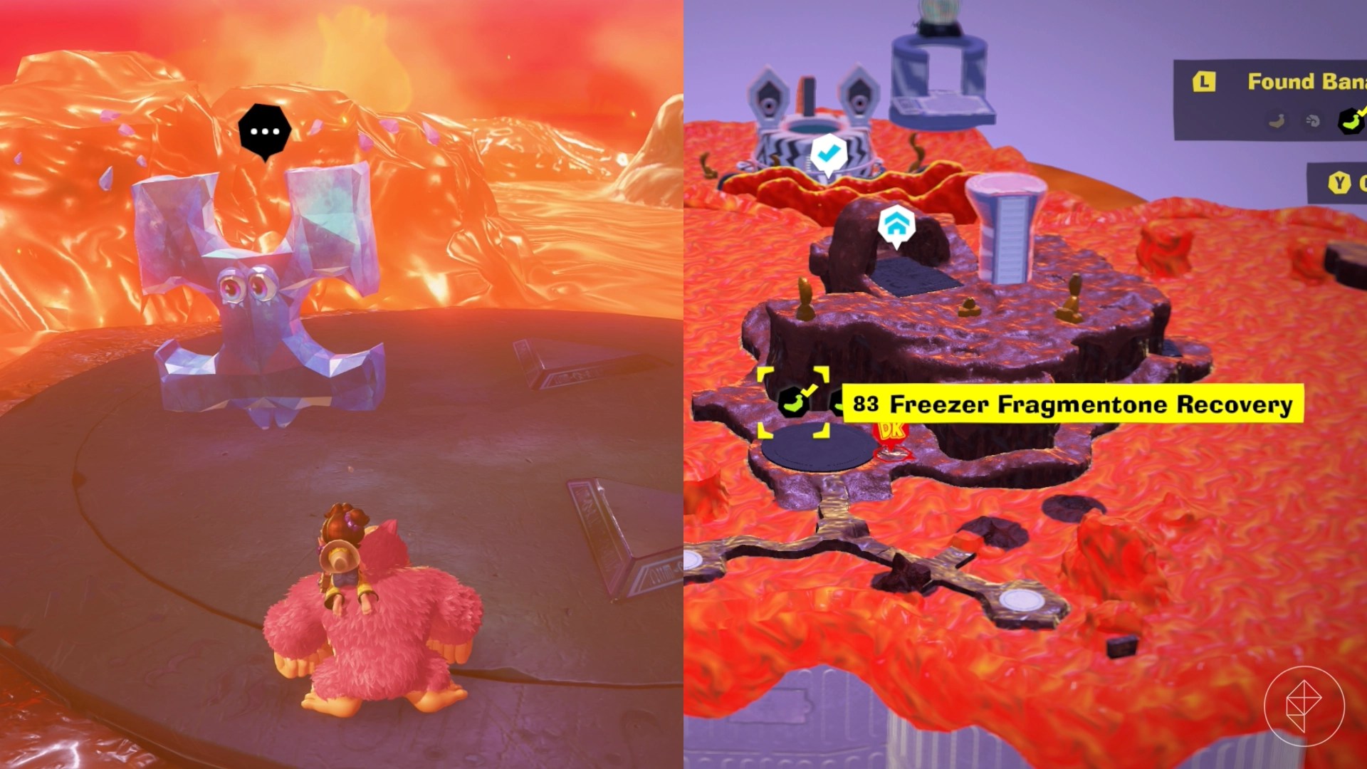 Use ice chunks to make a path up the wall of lava, where you’ll find a Banandium Gem on a bed of gold. You’ll likely run into this banana as part of the main story.