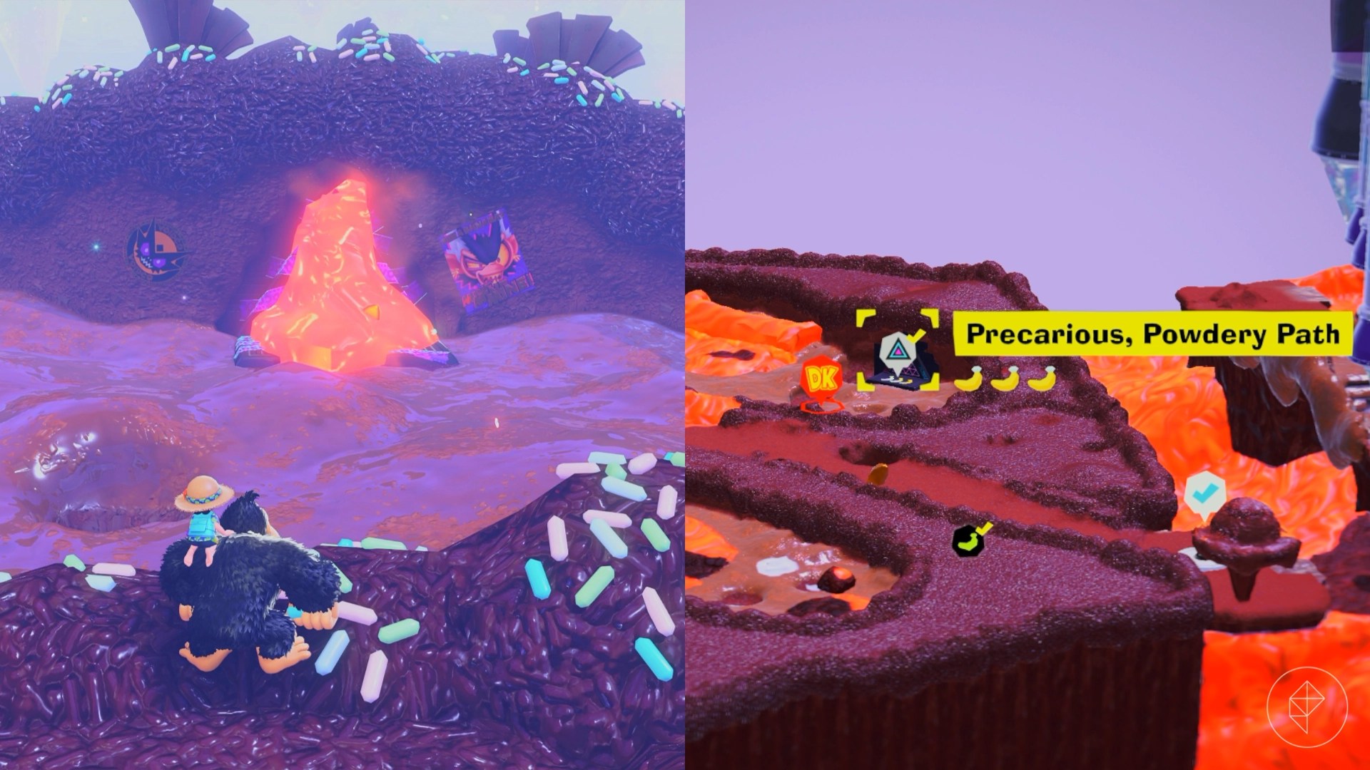 After you get your Zebra Bonanza powers, cross the crumbly bridge towards the floating island. On the island you’ll find the Floating Chocolava Lake Getaway and a shifty challenge. Destroy the blocks across the ice and lava platforms to get a banana.