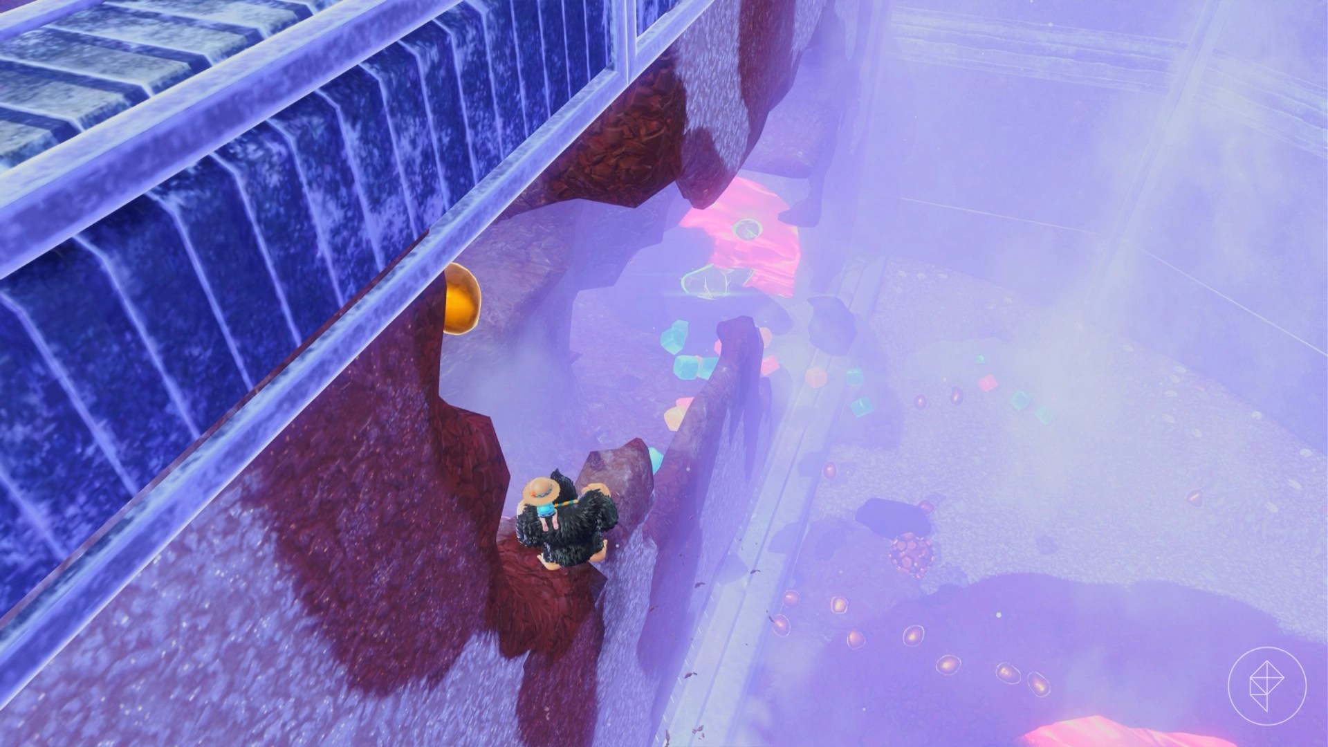 To reach this area, you’ll first need to unlock the Zebra Bananaza transformation. Afterward, teeleport to the Coolstripe Cavern Ledge Getaway (located next to Banandium Gem #28, Sitting on the Snow). Cross the crumbly bridge in zebra form and make your way over to the floating island. Because snow is a soft material, it’ll latch onto other objects if you throw it. Repeatedly throw snow chunks at the island until you create a snow bridge to your position. Cross over and collect the gem.