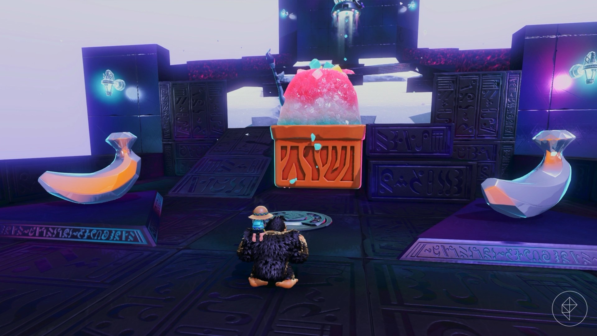 Face the pillar with the switch that activates the ice machine, and turn left. You’ll see a zebra standing near a small square platform of crumbly ice that turns into a path as you walk on it. Transform into Zebra Bananza — using the gold clusters nearby to replenish your Bananza meter if need be — and follow the ice path to the gem. The path develops slowly, so don’t use Zebra Bananza’s charge or you’ll fall into the lava below.