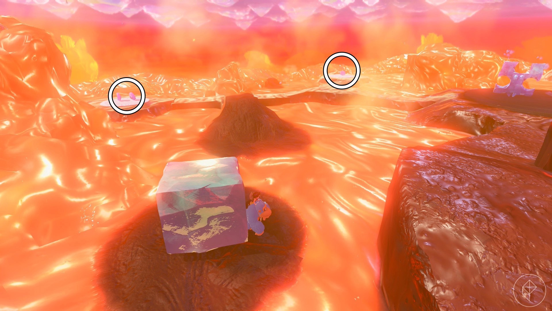 Near the molten chocolate at the back of the island with the ice machine controls is a broken Fragmentone who, as usual, is missing three pieces. One is to their right on a small island surrounded by lava, but they’ll fall into the lava if you try walking along the path as it is. Grab ice chunks off the never-melt ice cube to the left of the main Fragmentone to clear lava away and make a safe path.