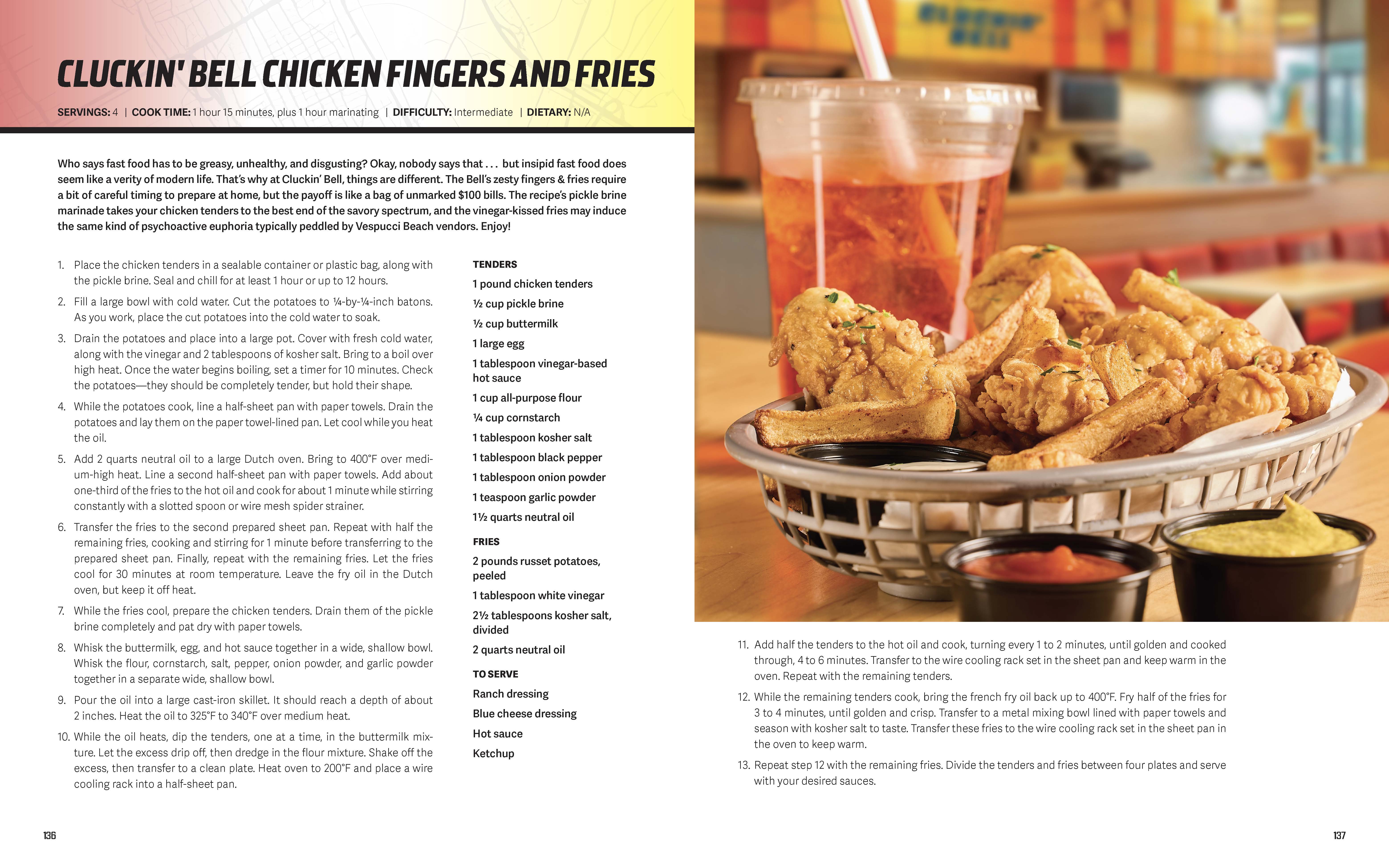 If you’ve been left hungry after hunting for Cluck Norris figures in Cluckin’ Bell, you can prepare their signature chicken fingers and fries. The recipe uses a Dutch oven rather than a deep fryer, though you’ll want to plan this mission in advance since the chicken needs to soak in pickle brine for one to 12 hours before cooking before being coated with buttermilk and hot sauce. Adding vinegar to the fries gives them some extra savory kick.