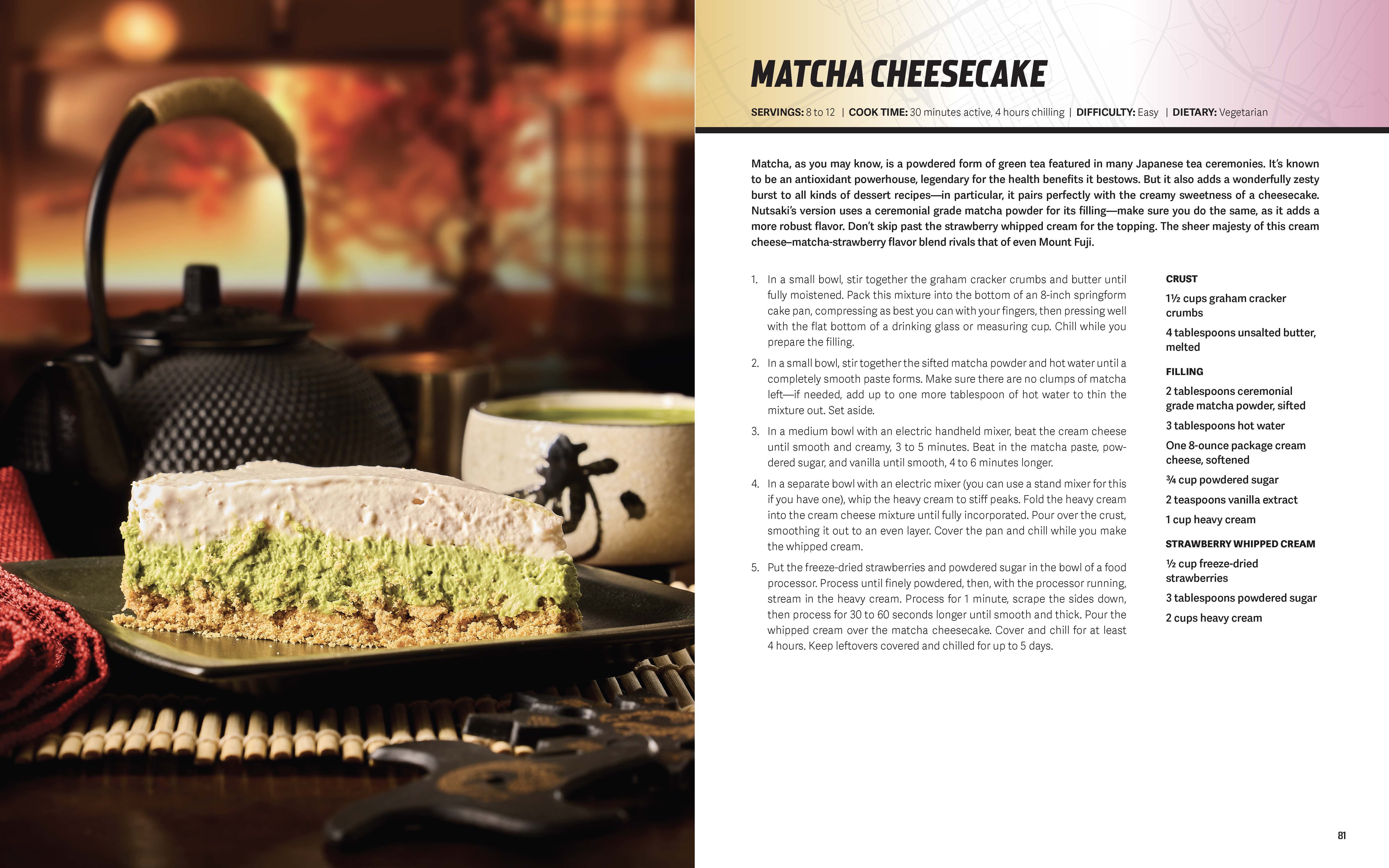 For something sweet, head to Nutsaki on San Andreas Avenue in Los Santos for matcha cheesecake. You’ll need ceremonial grade matcha powder to get the most robust flavor, blending it into a paste and then using a handheld mixer to combine it with cream cheese, powdered sugar and vanilla. A graham cracker crust and a strawberry whipped cream provide layers of flavor. While it only takes about 30 minutes to make, you’ll need to let it chill for four hours before eating. The cake serves eight to 12, but if you don’t want to share, it will also last for up to five days.