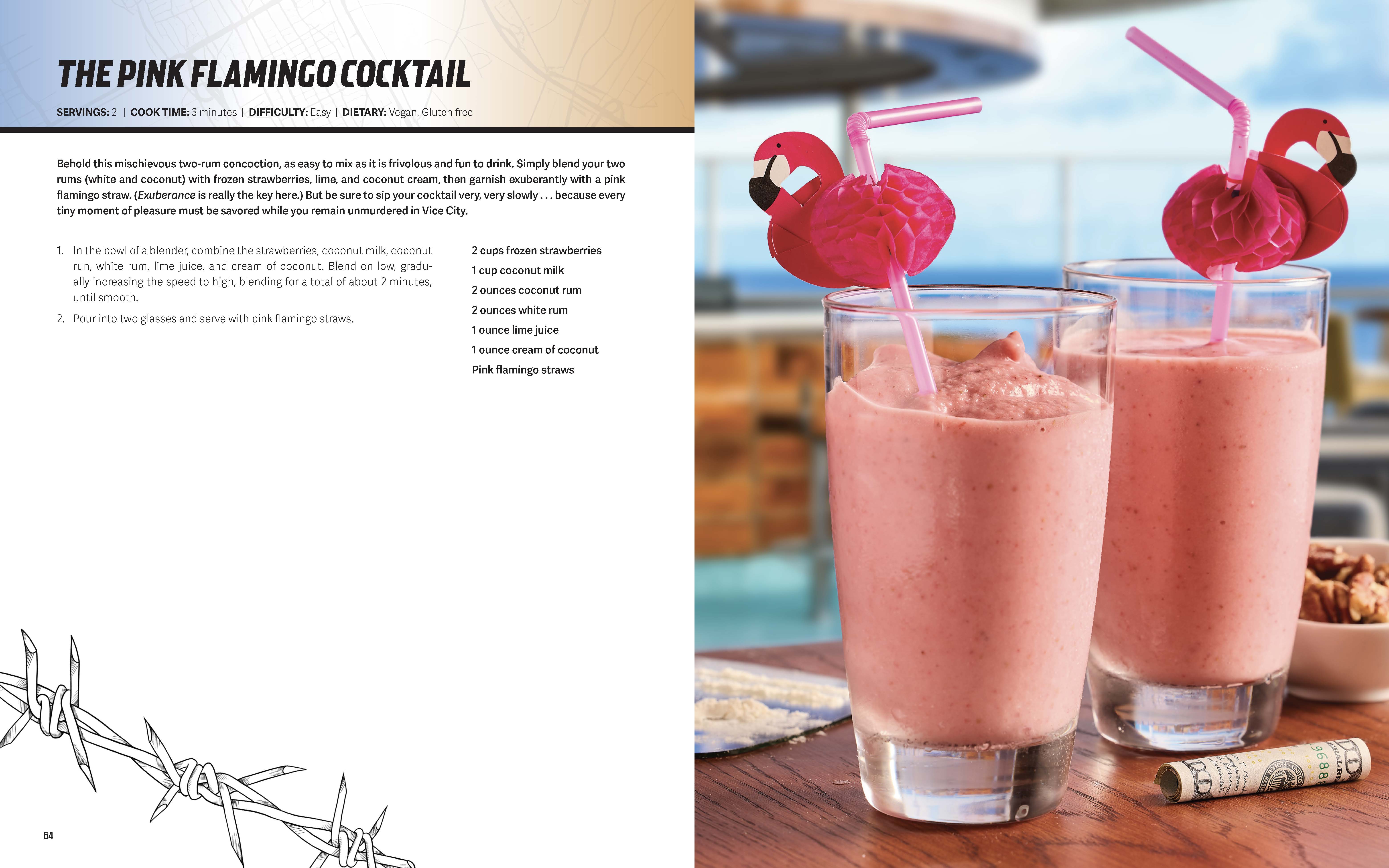 Publisher Insight Editions gave us an early look and the chance to exclusively reveal a few recipes. The book spans all of the major cities in the GTA universe, using their real world inspirations to guide the culinary influences. The playful photography positions plates next to bullets, guns, stacks of cash, drugs, and even throwing stars while providing simple step-by-step instructions for entrees, drinks, and desserts.