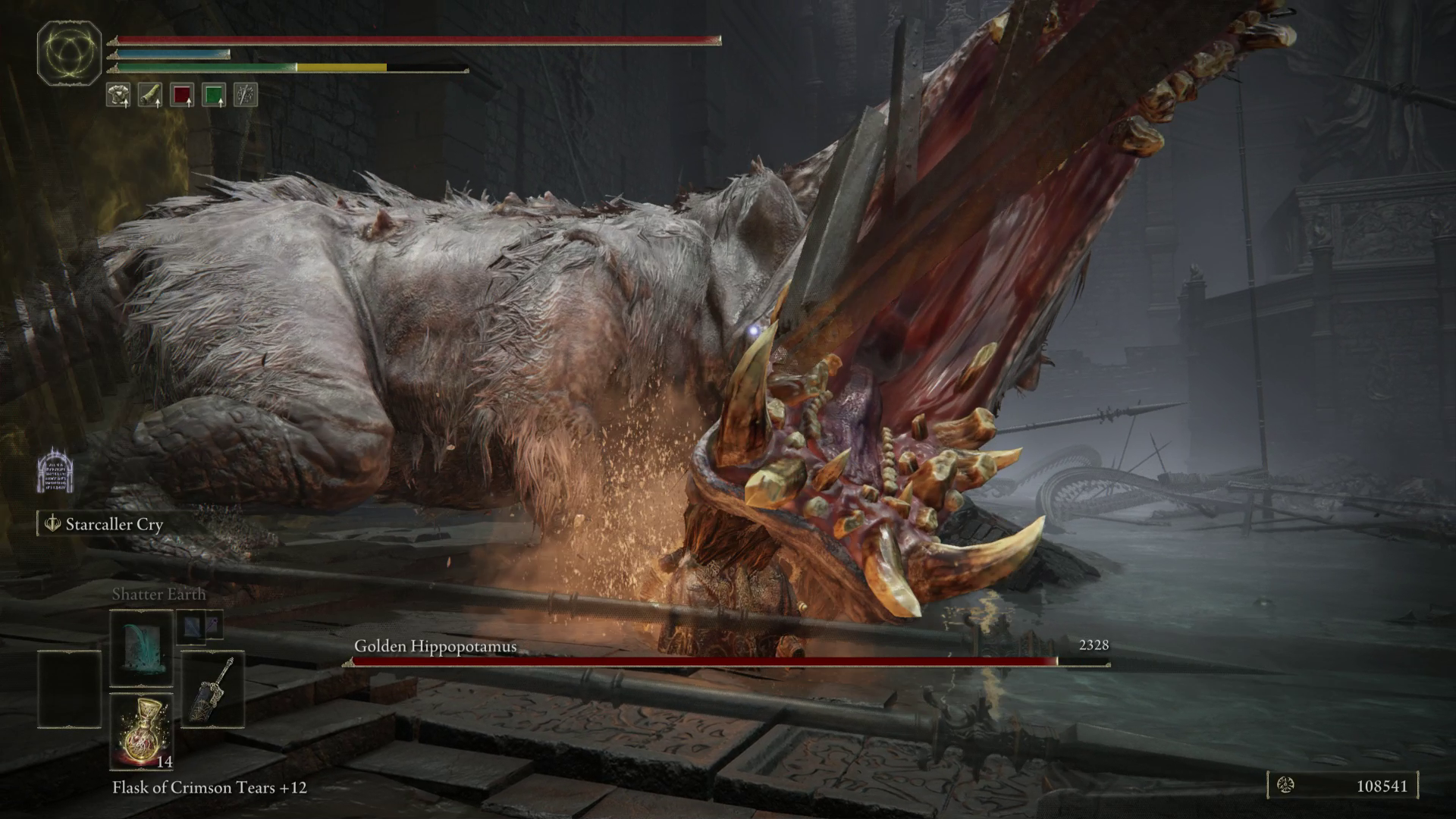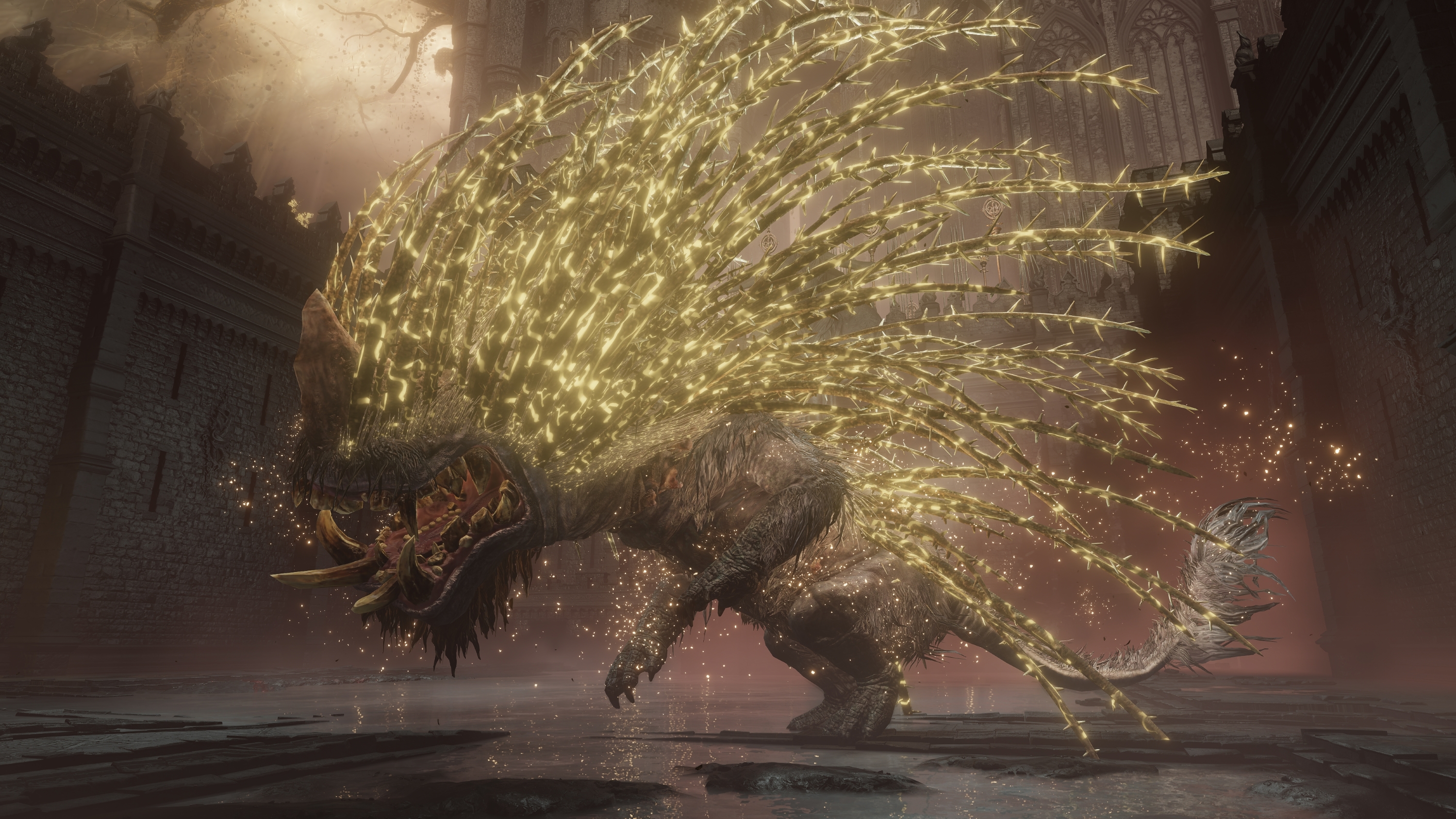 In his original form from Erdtree, the Golden Hippopotamus is a challenge for entirely different reasons than in Elden Ring Nightreign. For one thing, he greets players in a cramped room, one that doesn’t allot nearly enough square footage to gracefully fight a hippo-sized enemy and avoid all its big swinging attacks. For another, due to the tight space and erratic movement, the camera also becomes an enemy, as it wildly clips into walls and doesn’t focus too well on the locked-on boss. But most of all, the Golden Hippo’s moveset involves spawning golden quills from its back and shooting them at you like arrows. Turns out, in Erdtree, this hippo has more in common with a hedgehog or porcupine than a rhino or pitbull. (What’s worse is that other variants of Golden Hippo without golden incantations show up three more times throughout the DLC.)