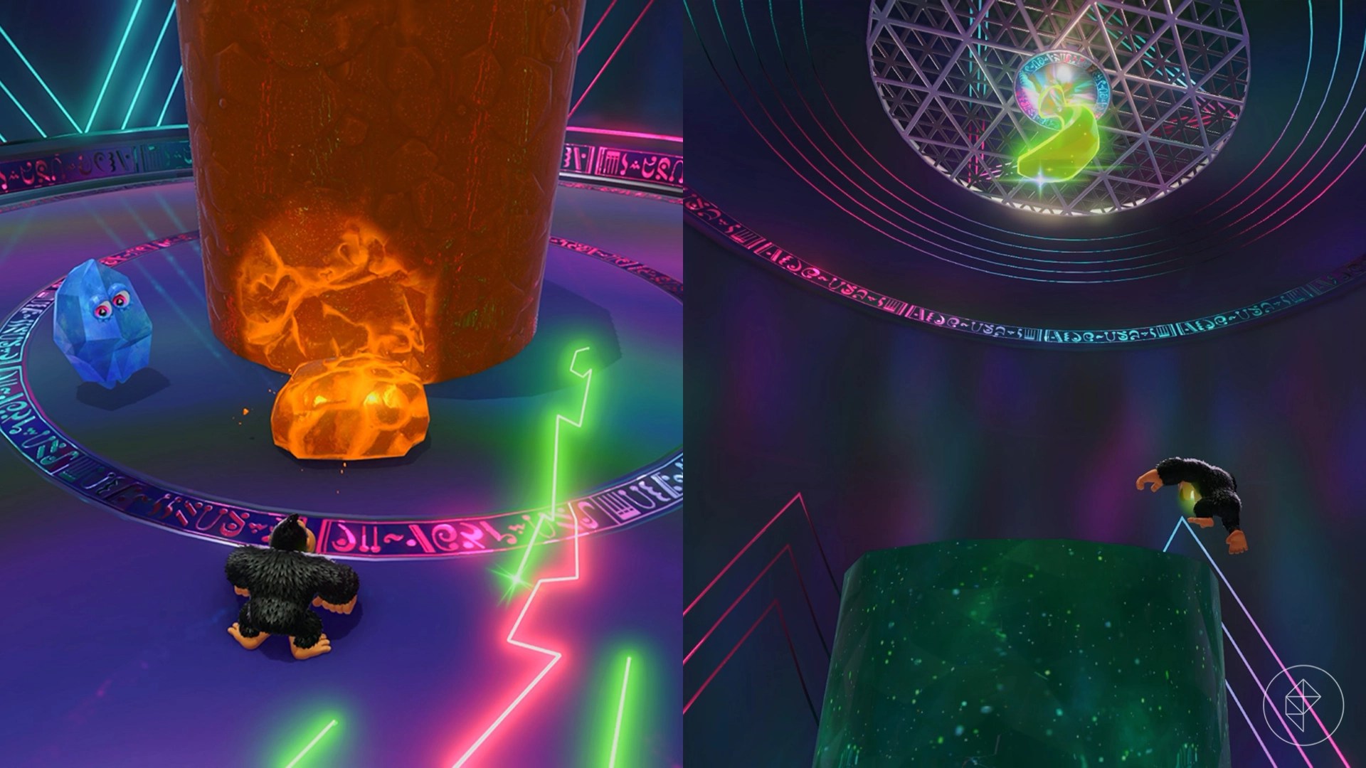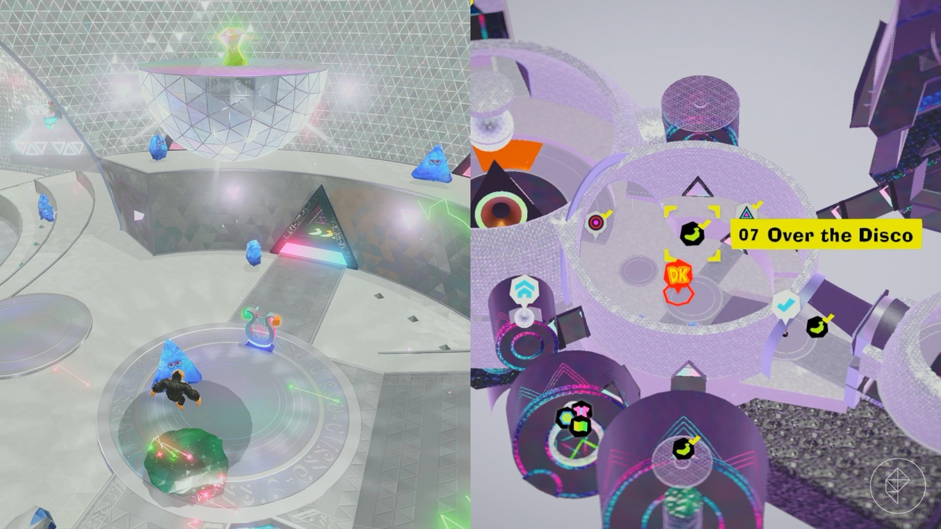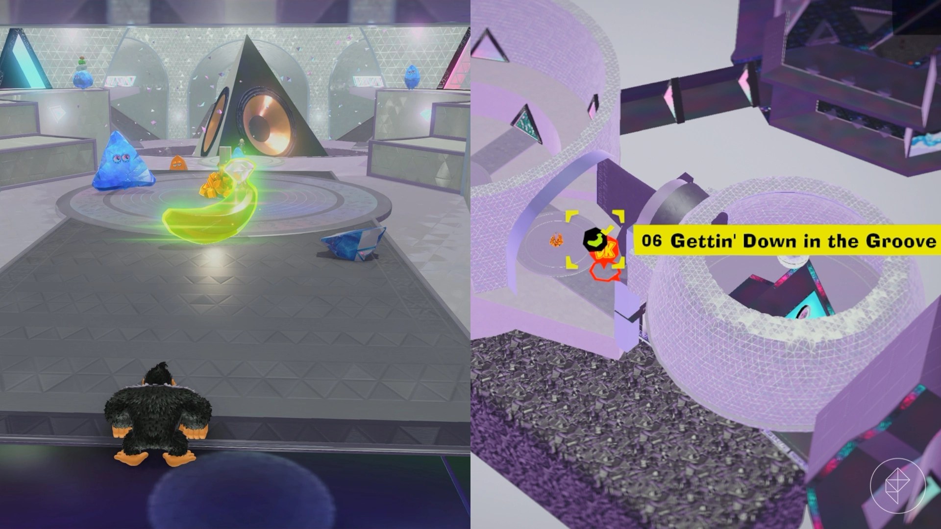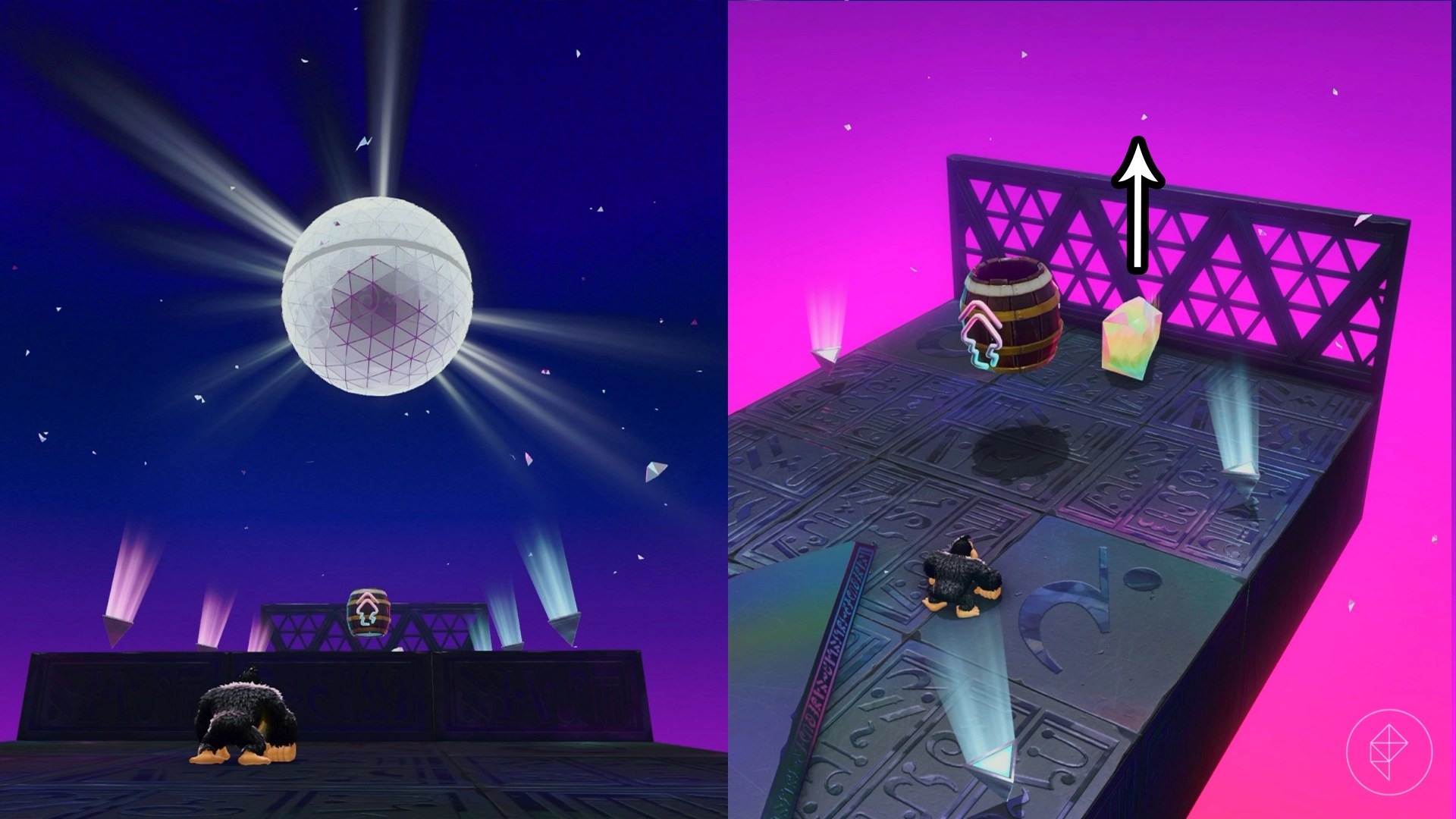 Use the rubber Fractone as a bounce pad and dive punch your way up to the banana on top of the disco ball. If you’re having a hard time reaching the top, make sure to hold down the A button to reach higher elevation.
