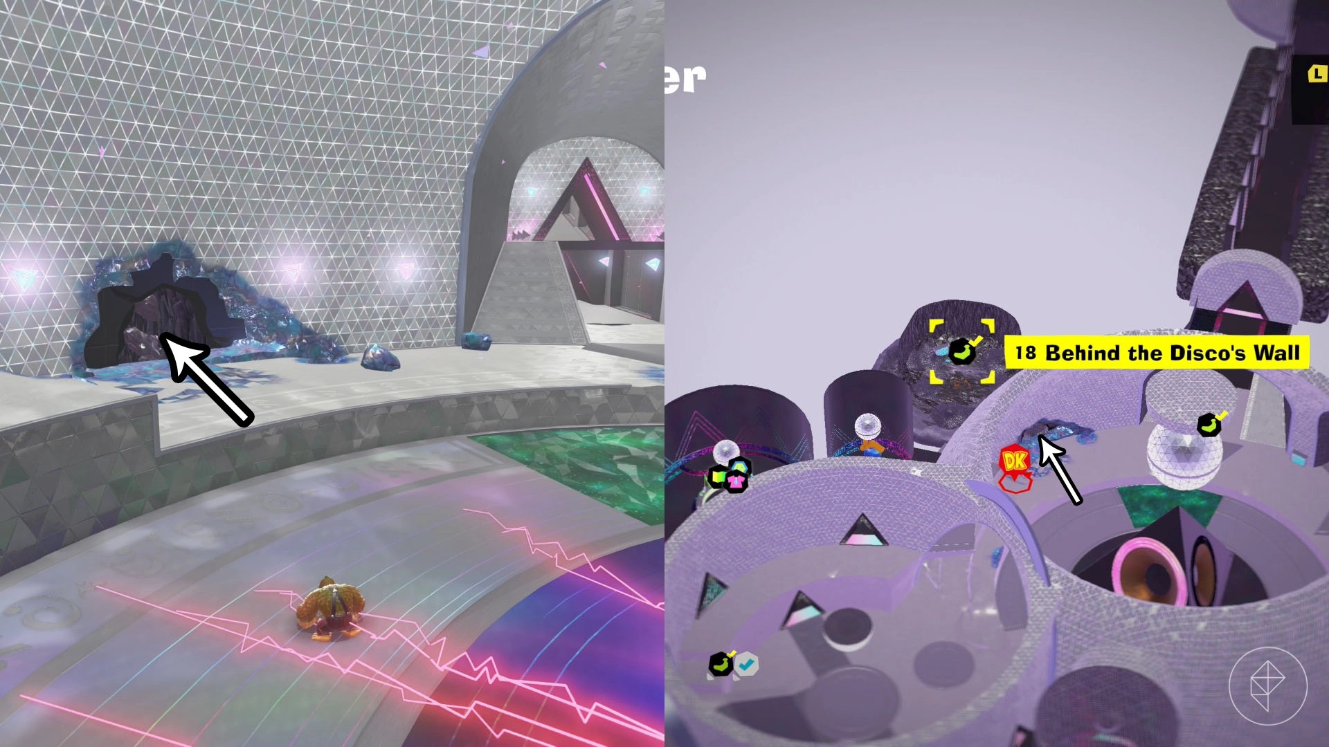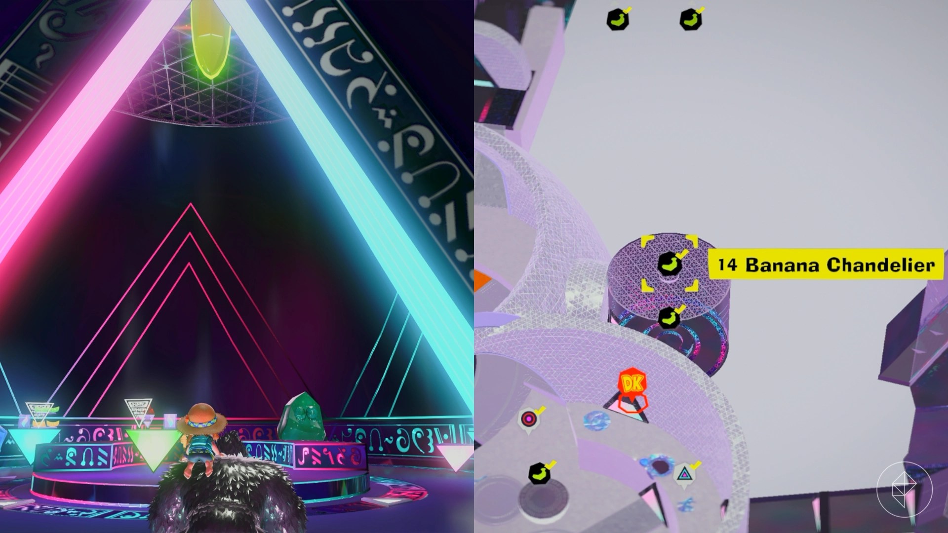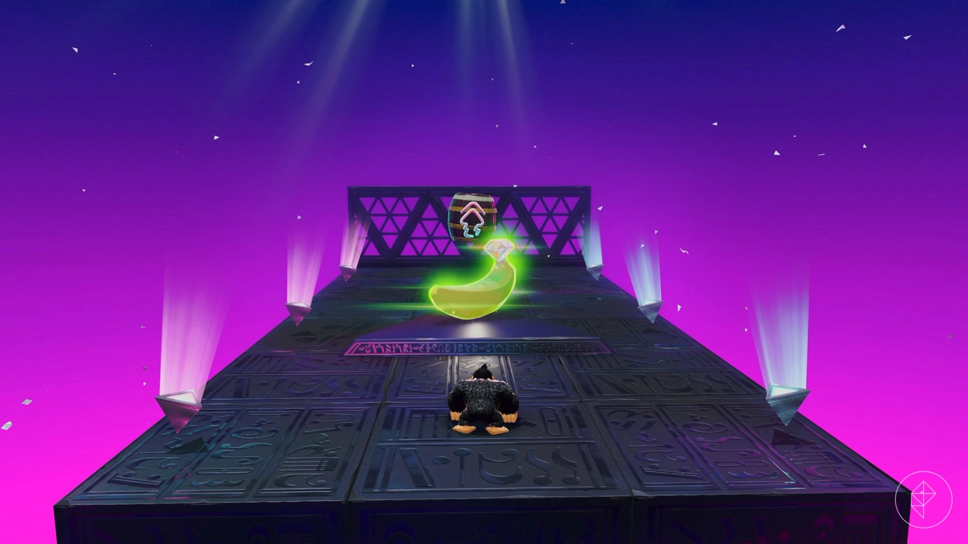 At the very top of the challenge course, you’ll find a huge disco ball above the exit barrel and a patch of liftoff ore beside a Swap Harp. Swap the liftoff ore to mud and place a chunk of it behind the exit barrel. Swap the mud back to liftoff ore and ride the liftoff ore to the top of the disco ball. Smash your way through to find a banana hidden inside.