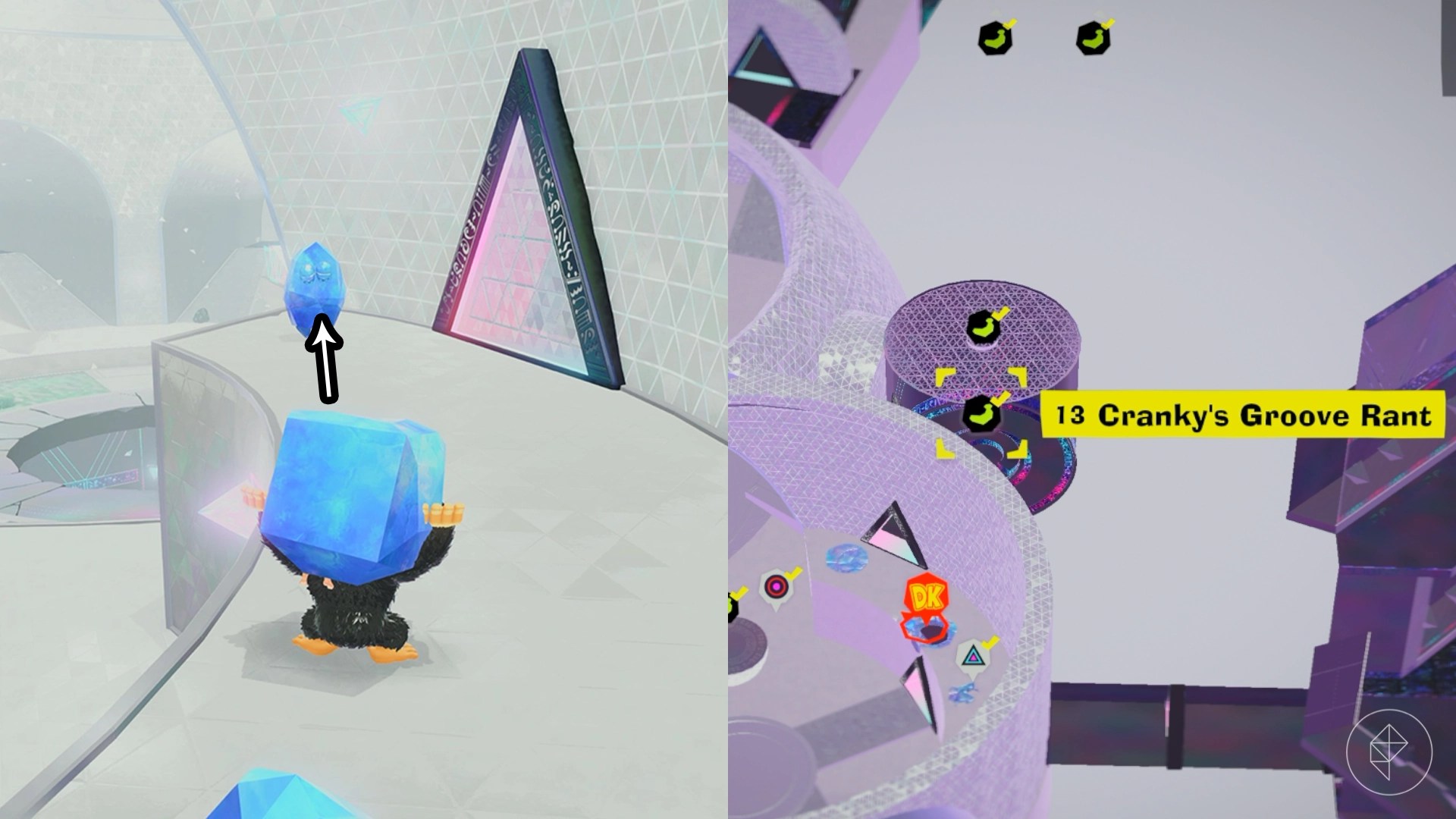 Back in the Disco Hall, take the path above the challenge course to find a Fractone that’ll transform into a steel cube in front of the door to the VIP room. Before the Fractone can transform, throw a chunk at the Fractone to destroy it — opening the door behind it in the process. Head inside to find Cranky Kong and listen to his spiel to get a banana.