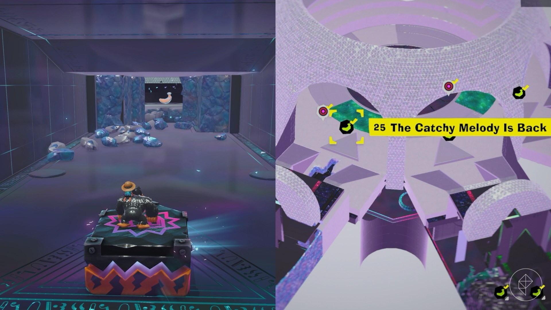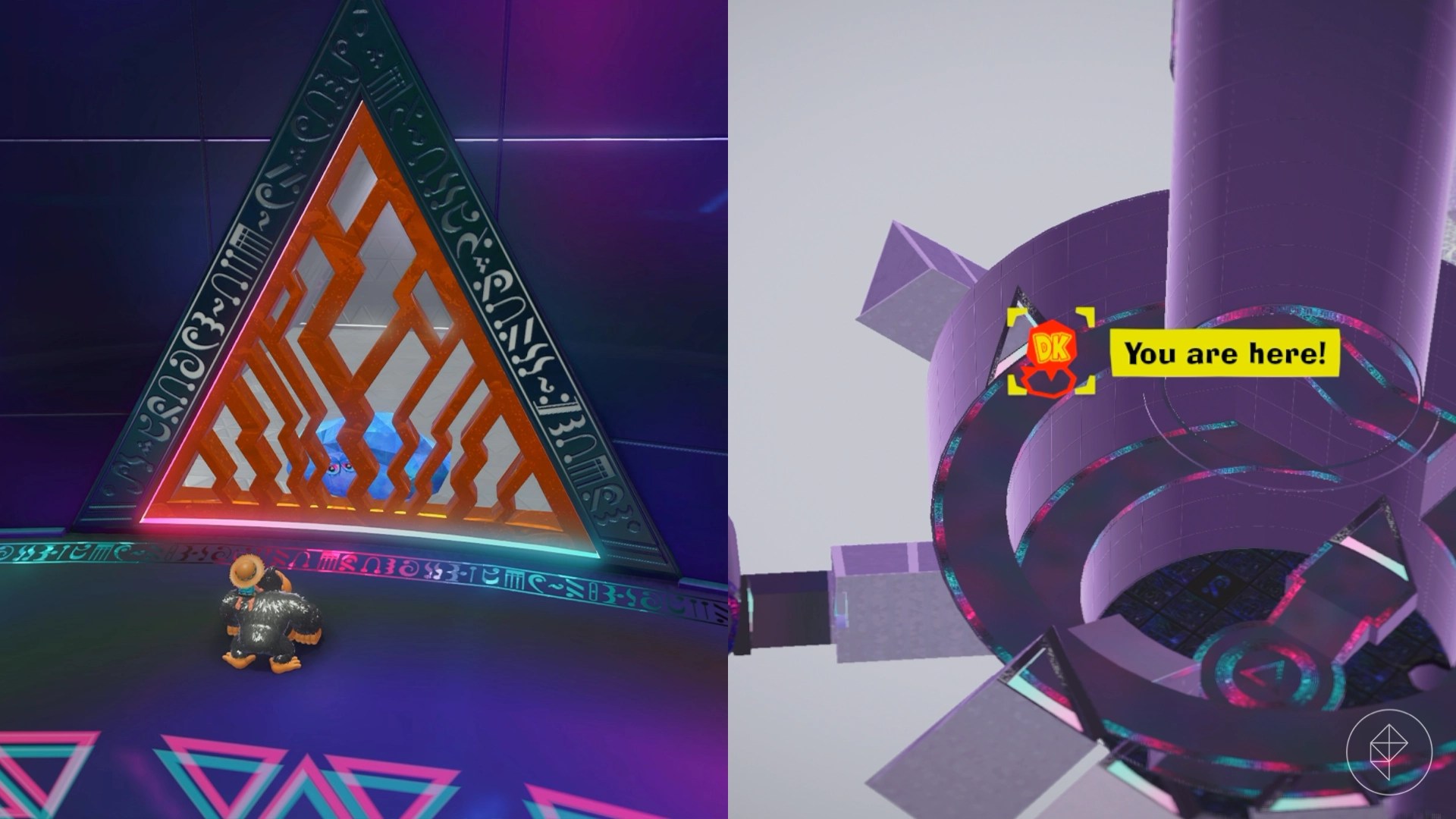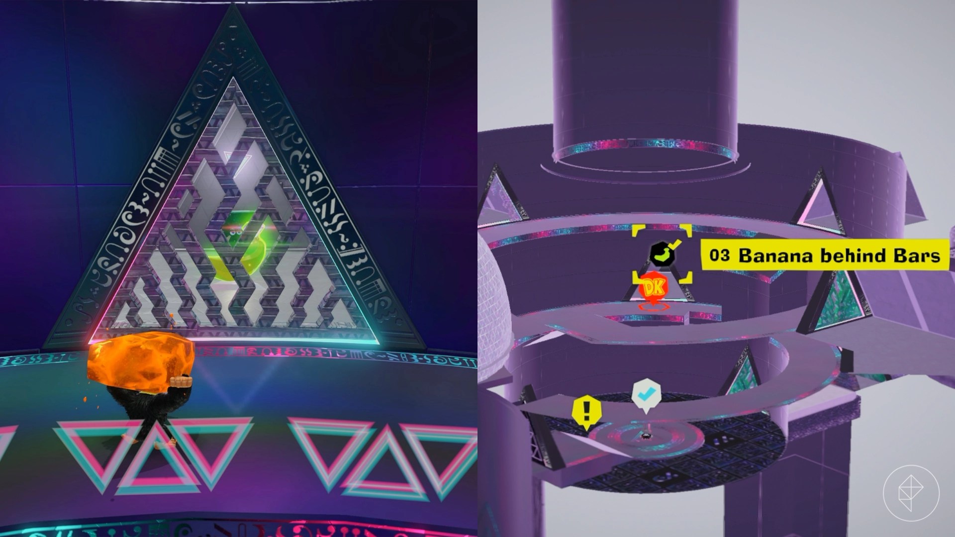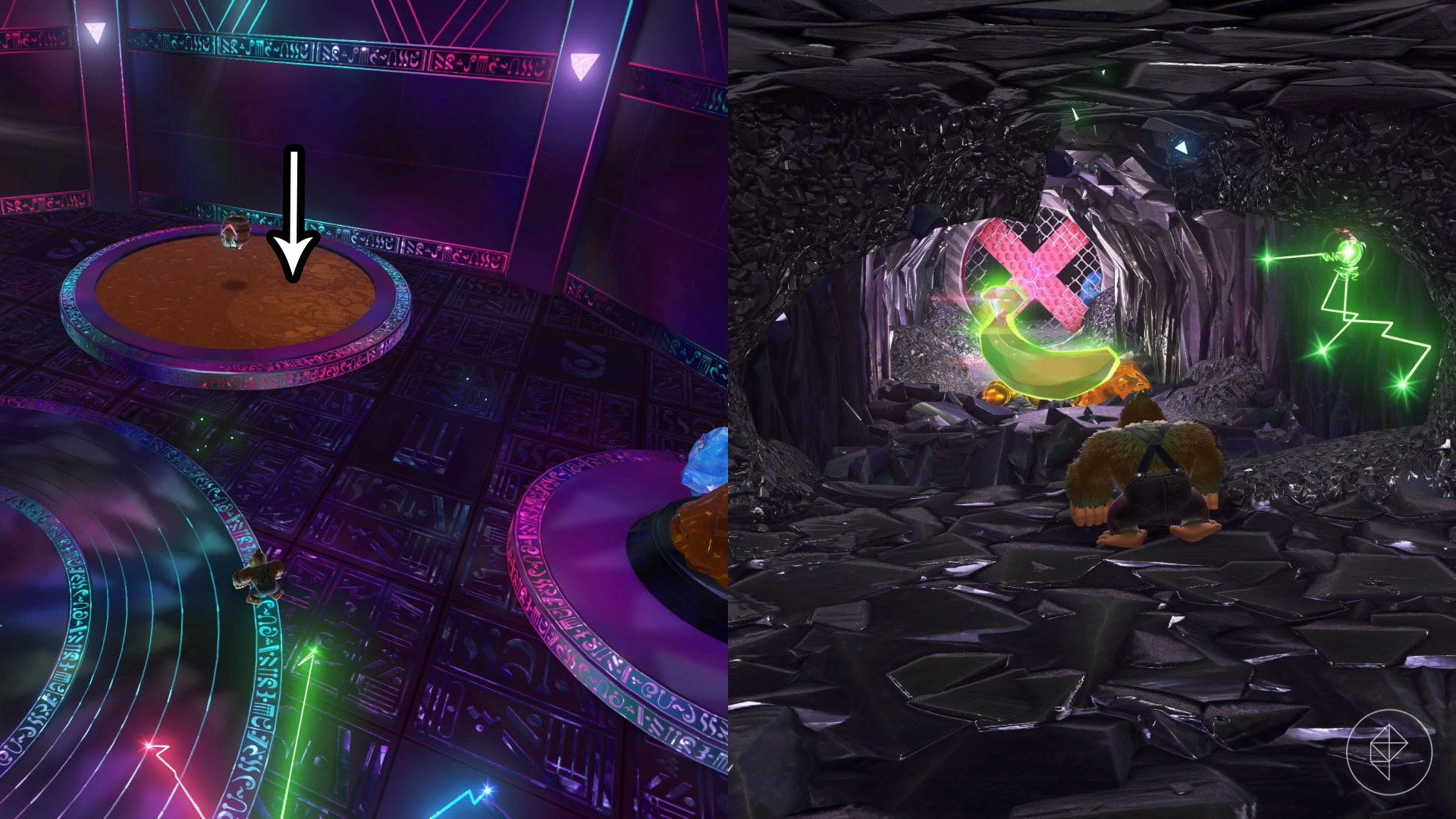 When going after the third music source, there will be two Void-face walls to your right in the corridor. Behind the second one, there’s a room with the banana on top of a higher platform. If you enter the room, a gold platform will rise up from the ground, but do not immediately break it! Hit a Swap Harp to turn the gold into rubber and bounce off of it to reach the banana.